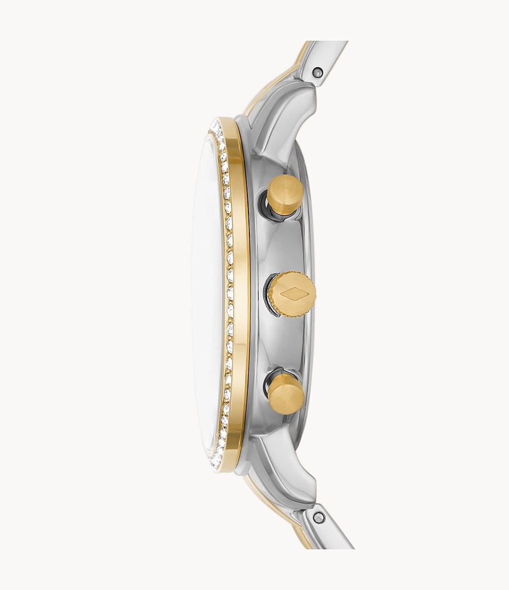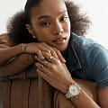 Женские американские часы-хронографХронографФункция позволяет измерять отрезки времени с особой точностью: часы, минуты, секунды. Верным признаком хронографа является наличие на циферблате 3 дополнительных окошек-счётчиков. с секундомеромСекундомерСекундоме́р — прибор, способный измерять интервалы времени с точностью до долей секунды. Fossil Neutra ES5216, кварцевый механизм с высокой точностью. Класс водозащиты: 50 метров, позволит защитить корпус от случайных брызг или капель дождя. Корпус и браслет часов изготовлен из стали с частичным IP-покрытиемIP-покрытиеМетод ионного напыления. Демонстрирует повышенную устойчивость к истиранию, окислению и химическим веществам. Под воздействием высокого давления и температуры около 1500°C молекулы металла надёжно соединяются с частицами корпуса часов.. Система отображения времени 12-ти и 24-х часового формата. БезельБезельВнешний ободок, закрепляющий стекло. В спортивных часах так называется поворотное кольцо с делениями на циферблате, выполняет роль таймера – замеряет отрезки времени на шкале. Неподвижный безель – элемент декора. Однонаправленно вращающийся безель на дайверских часах позволяет фиксировать моменты погружения и выныривания на поверхность. украшен кристаллами. Циферблат перламутровый серебристый с окошком даты между 4 и 5 часами.