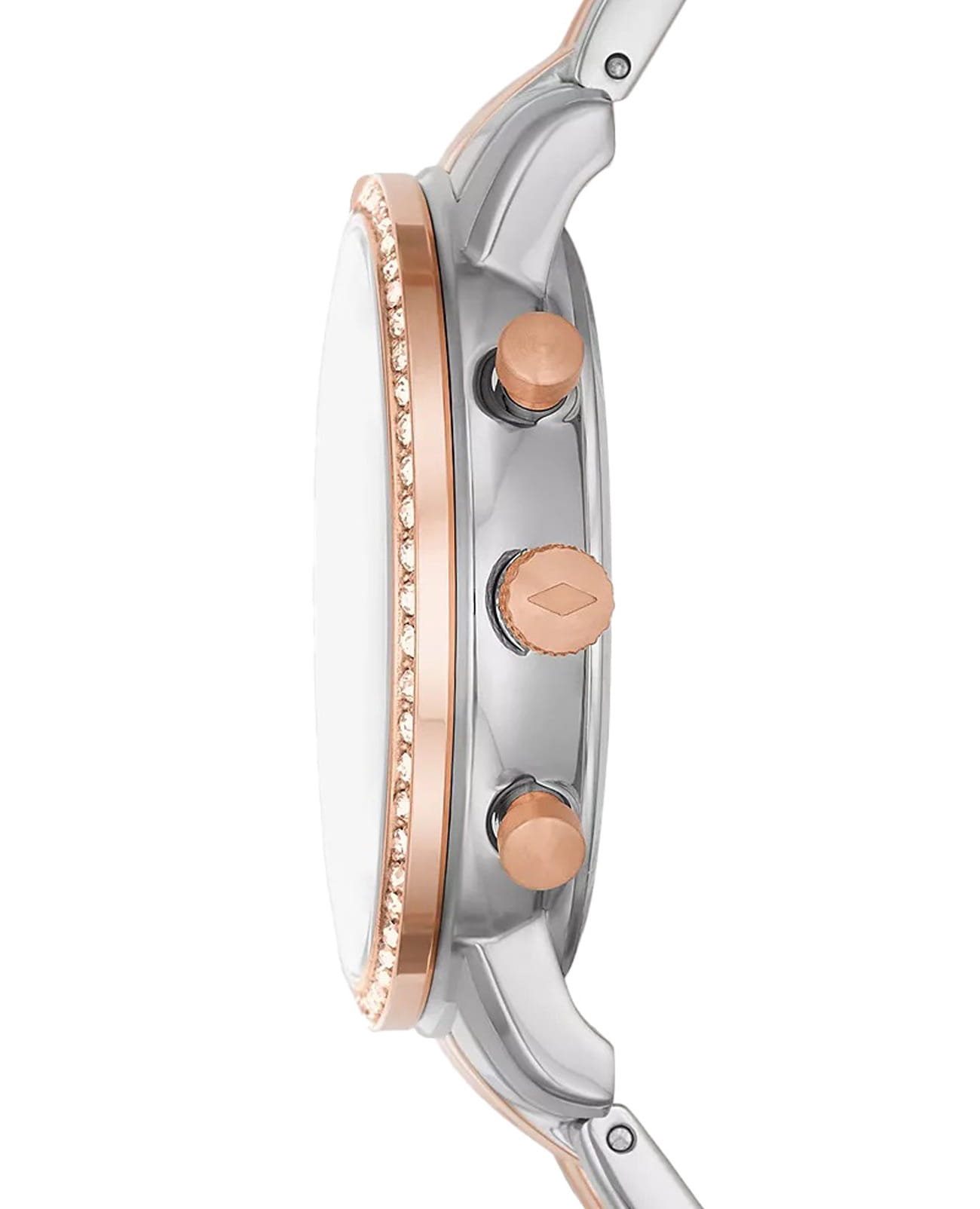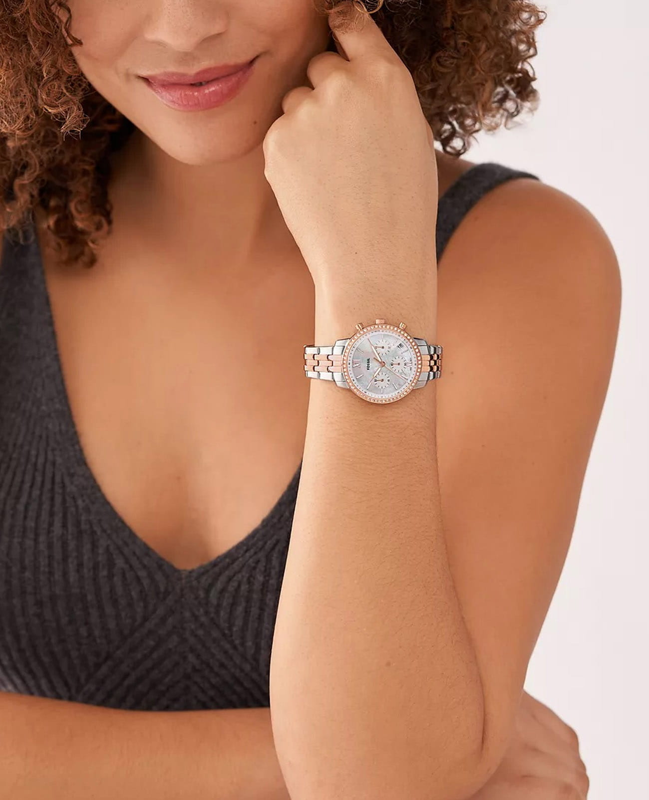 Женские американские часы-хронографХронографФункция позволяет измерять отрезки времени с особой точностью: часы, минуты, секунды. Верным признаком хронографа является наличие на циферблате 3 дополнительных окошек-счётчиков. с секундомеромСекундомерСекундоме́р — прибор, способный измерять интервалы времени с точностью до долей секунды. и с минеральным стекломМинеральное стеклоМинеральное стекло представляет собой искусственно выращенный минерал кварца. Такое стекло отличается особой устойчивостью к повреждениям и царапинам. Уступает по некоторым качествам сапфировому стеклу. Fossil Neutra ES5279, кварцевый механизм с высокой точностью. Корпус и браслет часов изготовлены из нержавеющей стали. БезельБезельВнешний ободок, закрепляющий стекло. В спортивных часах так называется поворотное кольцо с делениями на циферблате, выполняет роль таймера – замеряет отрезки времени на шкале. Неподвижный безель – элемент декора. Однонаправленно вращающийся безель на дайверских часах позволяет фиксировать моменты погружения и выныривания на поверхность. из нержавеющей стали с IP-покрытиемIP-покрытиеМетод ионного напыления. Демонстрирует повышенную устойчивость к истиранию, окислению и химическим веществам. Под воздействием высокого давления и температуры около 1500°C молекулы металла надёжно соединяются с частицами корпуса часов. украшен кристаллами. Окошко даты между 4 и 5 часами. Класс водозащиты: 50 метров, позволит защитить корпус от случайных брызг или капель дождя. Стальной браслет с частичным с IP-покрытиемIP-покрытиеМетод ионного напыления. Демонстрирует повышенную устойчивость к истиранию, окислению и химическим веществам. Под воздействием высокого давления и температуры около 1500°C молекулы металла надёжно соединяются с частицами корпуса часов. на раскладной застёжкеРаскладная застёжкаТакой тип застёжки используется только на браслетах из металла. Она никогда не раскрывается полностью, происходит разделение на 2 и более частей. Раскладывающая застёжка снизит вероятность потери часов к минимуму..