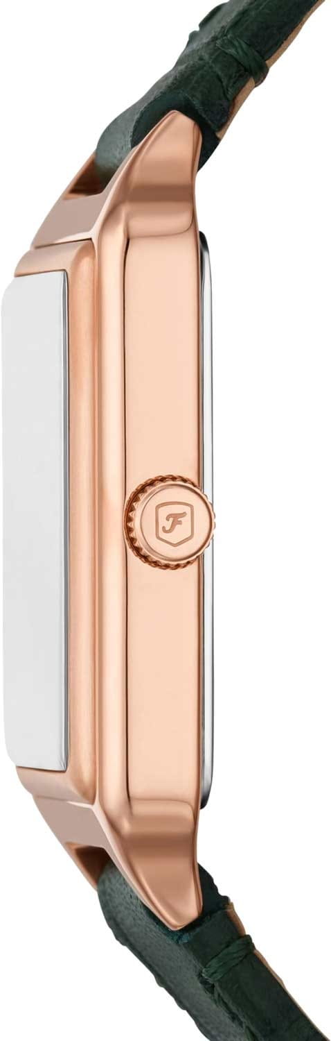 Fossil ES5366 – это стильные женские наручные часы, которые воплощают в себе классический дизайн в современном исполнении. Изготовленные в США, они оснащены надежным кварцевым механизмом с калибром Miyota GL10, что гарантирует высокую точность и долговечность. Прямоугольный корпус из стали с розово-золотистым IP-покрытиемIP-покрытиеМетод ионного напыления. Демонстрирует повышенную устойчивость к истиранию, окислению и химическим веществам. Под воздействием высокого давления и температуры около 1500°C молекулы металла надёжно соединяются с частицами корпуса часов. придаёт часам изысканный вид и повышенную устойчивость к износу. Зеленый матовый циферблат украшен римскими цифрами, подчеркивающими утонченность дизайна. Окошко даты, расположенное в положении 6 часов, добавляет функциональности и удобства в использовании. Рифленая заводная головка делает настройку времени легкой и комфортной. Часы обладают водозащитой 50WR, что позволяет не беспокоиться о случайных попаданиях влаги. Минеральное стеклоМинеральное стеклоМинеральное стекло представляет собой искусственно выращенный минерал кварца. Такое стекло отличается особой устойчивостью к повреждениям и царапинам. Уступает по некоторым качествам сапфировому стеклу. надежно защищает циферблат от царапин и повреждений. Удобный зеленый кожаный ремешок с классической застежкой обеспечивает комфортное ношение и стильный вид. Габаритные размеры часов составляют 23 мм в ширину, ширина браслета 12 мм и длина 175 мм, что делает их элегантными и компактными. Эти часы станут прекрасным дополнением вашего образа, подчеркивая вашу элегантность и индивидуальность.