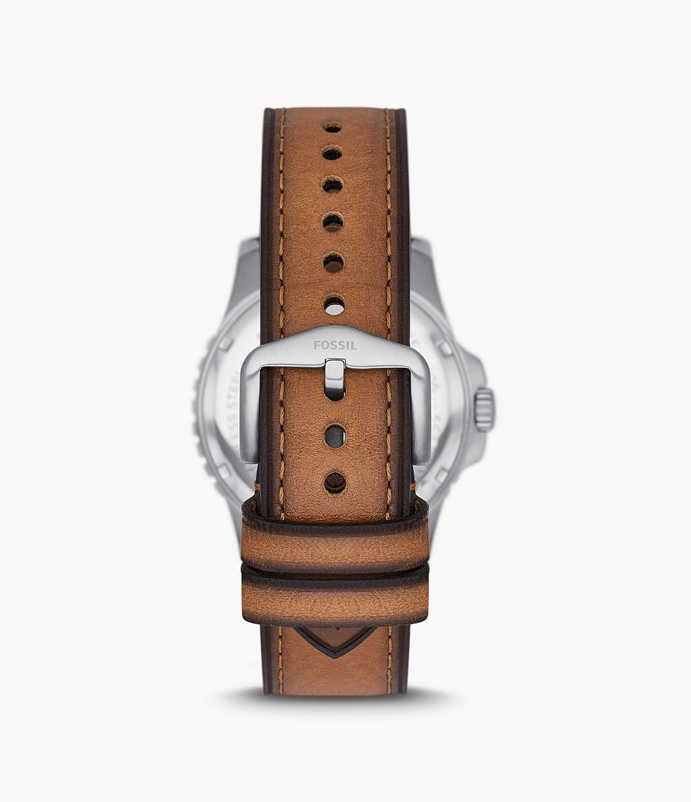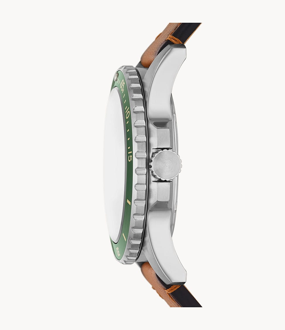 Мужские наручные часы Fossil Blue FS5946, кварцевый механизм с высокой точностью. Класс водозащиты: 100 метров, позволит плавать, нырять и заниматься другими водными видами спорта. Корпус часов изготовлен из стали с IP-покрытиемIP-покрытиеМетод ионного напыления. Демонстрирует повышенную устойчивость к истиранию, окислению и химическим веществам. Под воздействием высокого давления и температуры около 1500°C молекулы металла надёжно соединяются с частицами корпуса часов. зеленого цвета. Метки в виде точек на циферблате и окошко даты находится в положении 3 часа. Ремешок из экокожи коричневого цвета с классической застежкой.