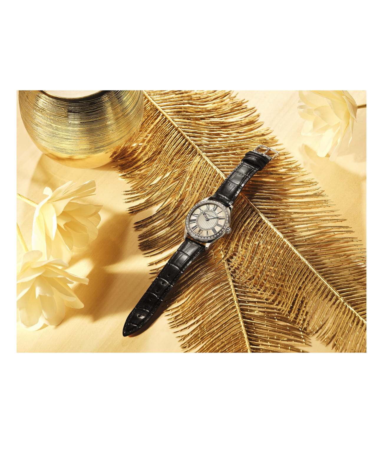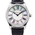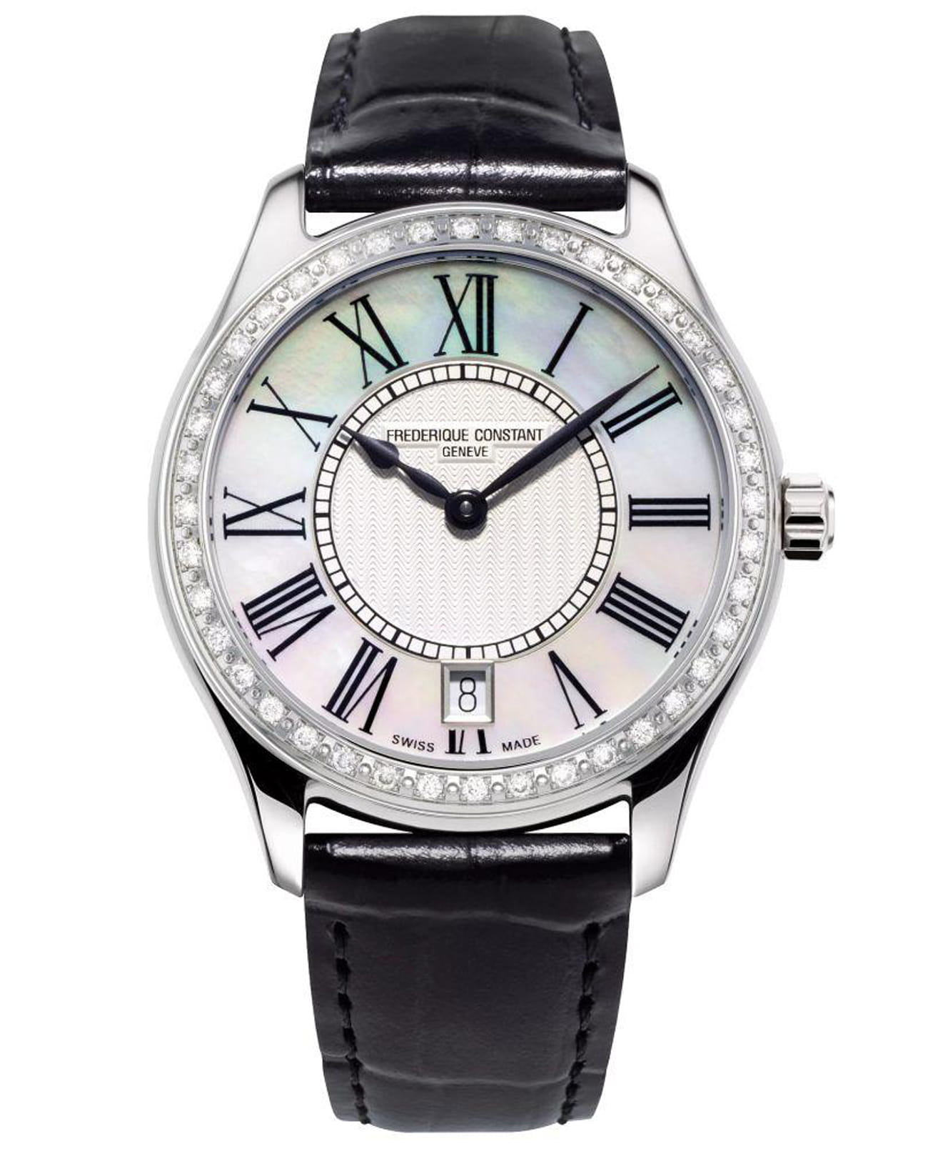 Женские наручные часы Frederique Constant Classics Ladies Quartz FC-220MN3BD6. Корпус из нержавеющей стали, украшен 40 бриллиантами. Диаметр корпуса 36 мм, водостойкость 5 ATM. Перламутровый циферблат с римскими цифрами. Ручная полировка, окошко даты на 6 часах. Кожаный ремешок черного цвета.