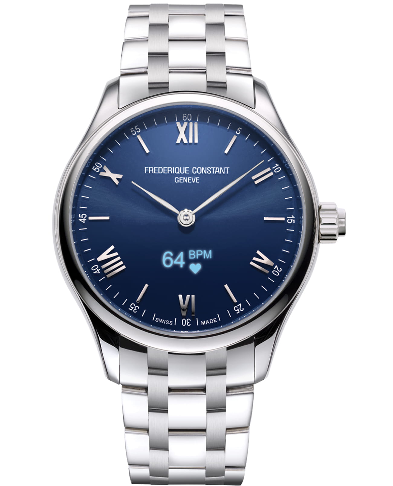 Мужские наручные часы Frederique Constant Smartwatch Gents Vitality FC-287N5B6B. Диаметр: 42 мм. Калибр FC-287. Электронная индикация даты. Интеллектуальные функции: датчик частоты сердечных сокращений, контроль физической активности, мониторинг сна, умный будильник, умный тренер. Синий циферблат. Часовая шкала: Отполированные вручную стальные стрелки, римские цифры. Выпуклое сапфировое стекло. Браслет: Нержавеющая сталь. Раскладывающаяся застёжка с кнопками.