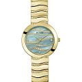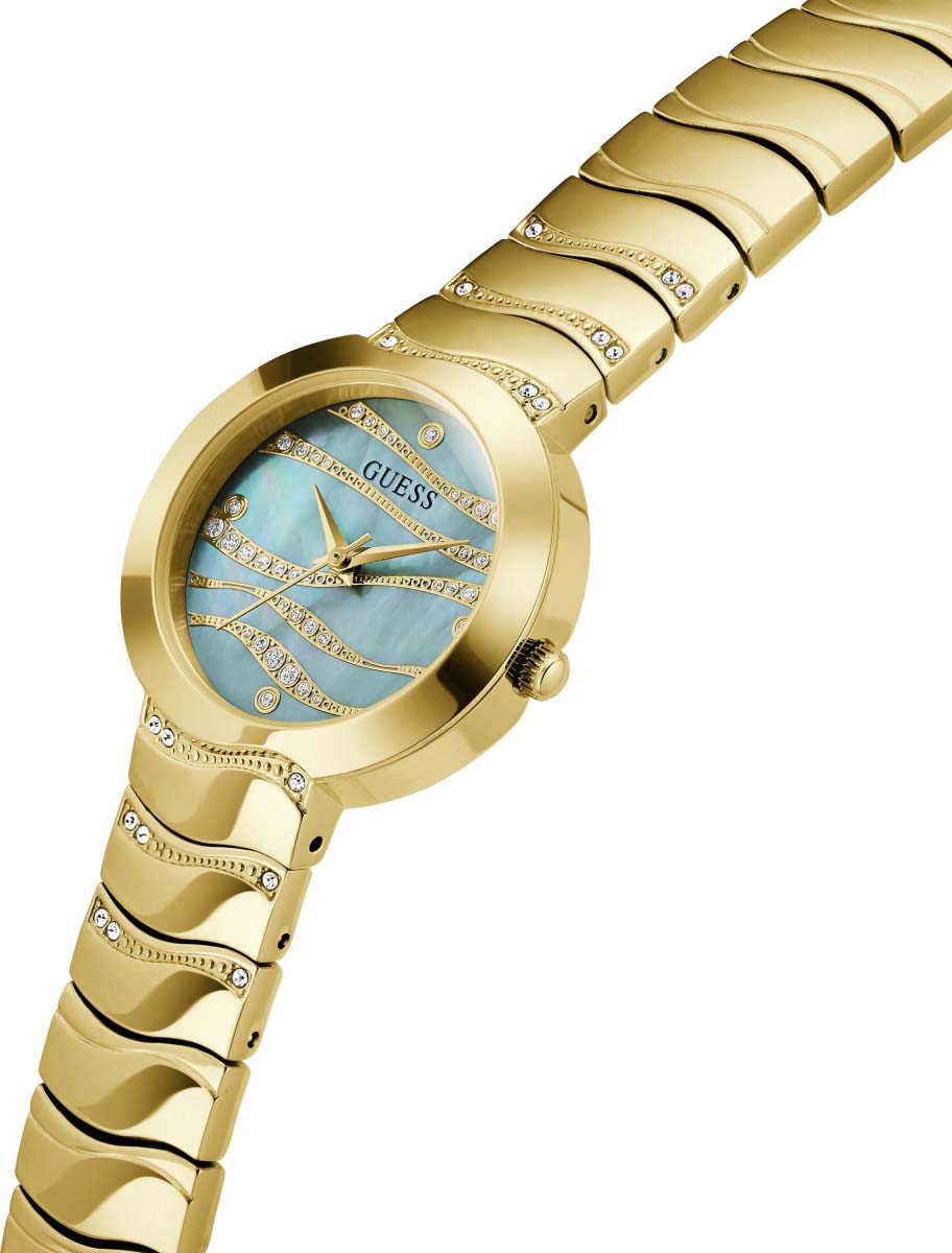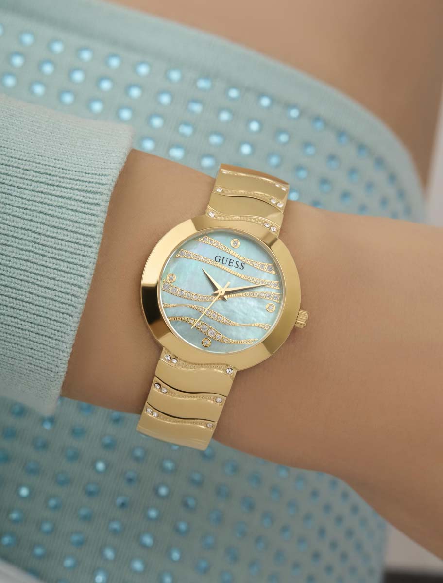 Часы Guess GW0871L1 — это стильный и утонченный аксессуар, который прекрасно дополнит образ современной женщины. Они оснащены надежным кварцевым механизмом. Корпус выполнен золотистой стали  PVD-покрытиемPVDУльтратонкое покрытие наносится в технике вакуумного напыления, сочетает в себе нитрид титана особой прочности со слоем золота или оксида хрома. Несёт в себе декоративную или защитную функцию. и украшен кристаллами, что придаёт часам роскошный и элегантный вид. Перламутровый голубой циферблат с волнообразными линиями создаёт эффект глубины и изысканности, а метки в виде точек добавляют утончённости. Часы имеют рифленую заводную головку для удобной настройки времени. Стальной браслет с золотистым PVD-покрытиемPVDУльтратонкое покрытие наносится в технике вакуумного напыления, сочетает в себе нитрид титана особой прочности со слоем золота или оксида хрома. Несёт в себе декоративную или защитную функцию. с волнообразными звеньями и раскладной застежкойРаскладная застёжкаТакой тип застёжки используется только на браслетах из металла. Она никогда не раскрывается полностью, происходит разделение на 2 и более частей. Раскладывающая застёжка снизит вероятность потери часов к минимуму. обеспечивает комфортное и надежное ношение, а также украшен кристаллами, что добавляет блеска и привлекательности. Водозащита 30WR гарантирует защиту от случайных брызг воды. Минеральное стеклоМинеральное стеклоМинеральное стекло представляет собой искусственно выращенный минерал кварца. Такое стекло отличается особой устойчивостью к повреждениям и царапинам. Уступает по некоторым качествам сапфировому стеклу. защищает циферблат от царапин и повреждений.