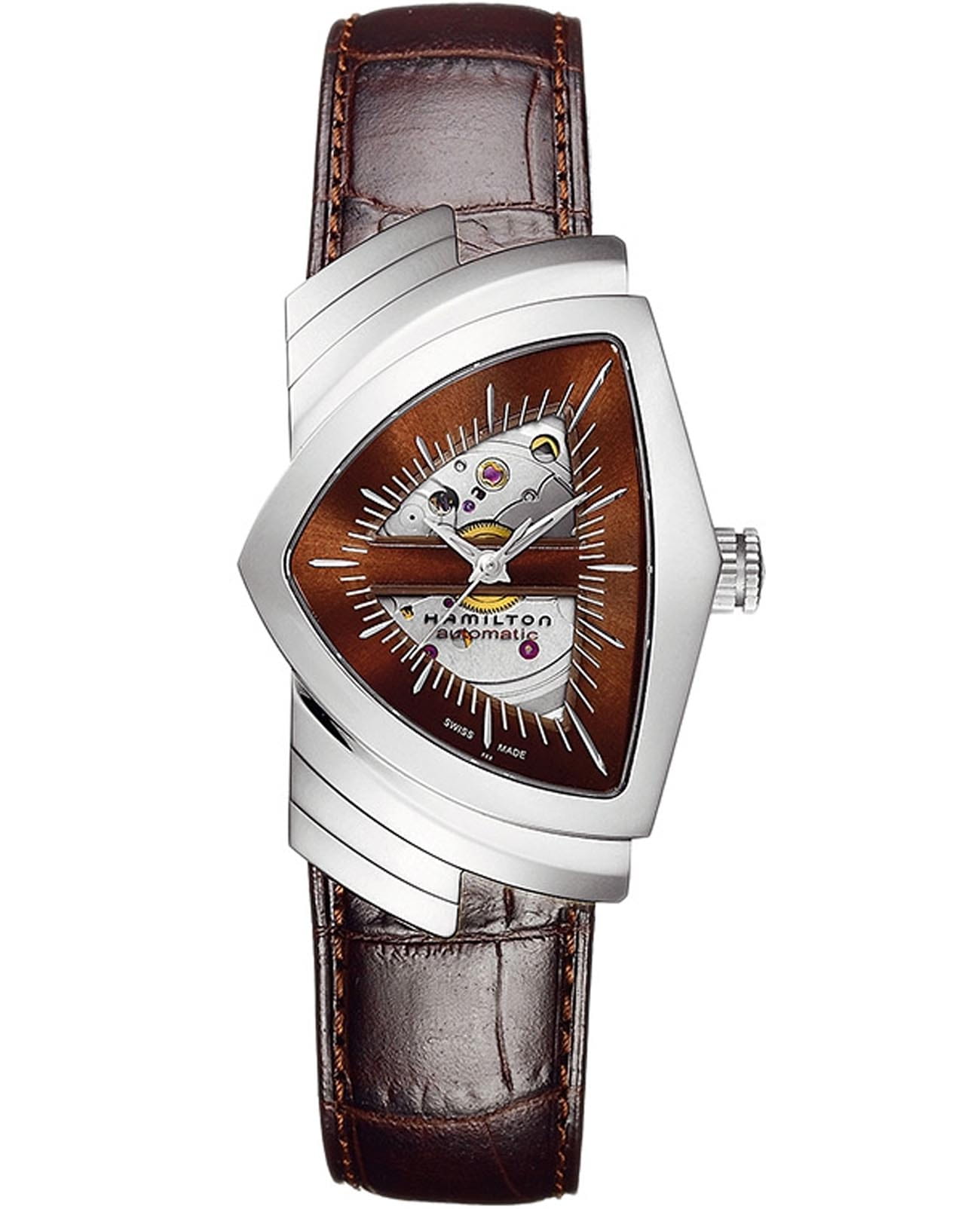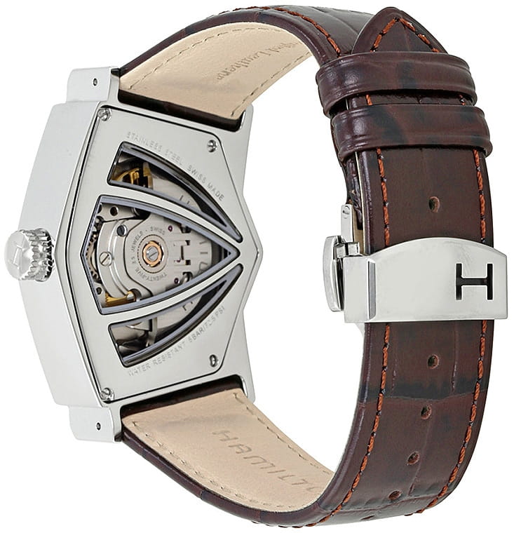 Мужские наручные часы-скелетоны Hamilton Ventura Auto H24515591 с надёжным автоматическим механизмом. Корпус часов изготовлен из нержавеющей стали. Практичный кожаный ремешок на застёжке "Бабочка". Сапфировое стеклоСапфировое стеклоПрочный и надёжный материал из кристалла сапфира синтетического происхождения, характеризующийся особой твёрдостью и устойчивостью к царапинам и повреждениям. устойчивое к мелким механическим повреждениям. Класс водозащиты: 50 метров, позволит защитить корпус от случайных брызг или капель дождя.