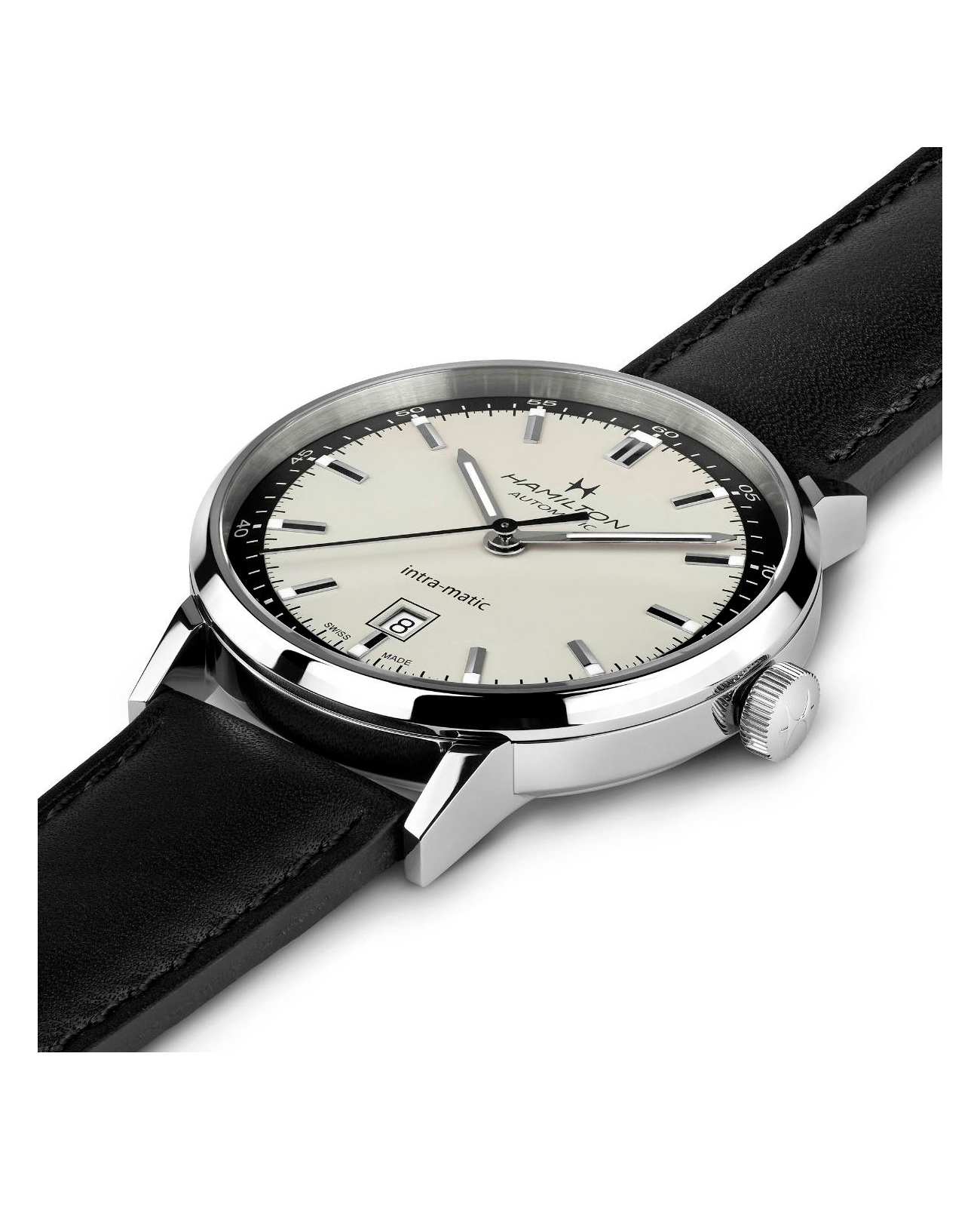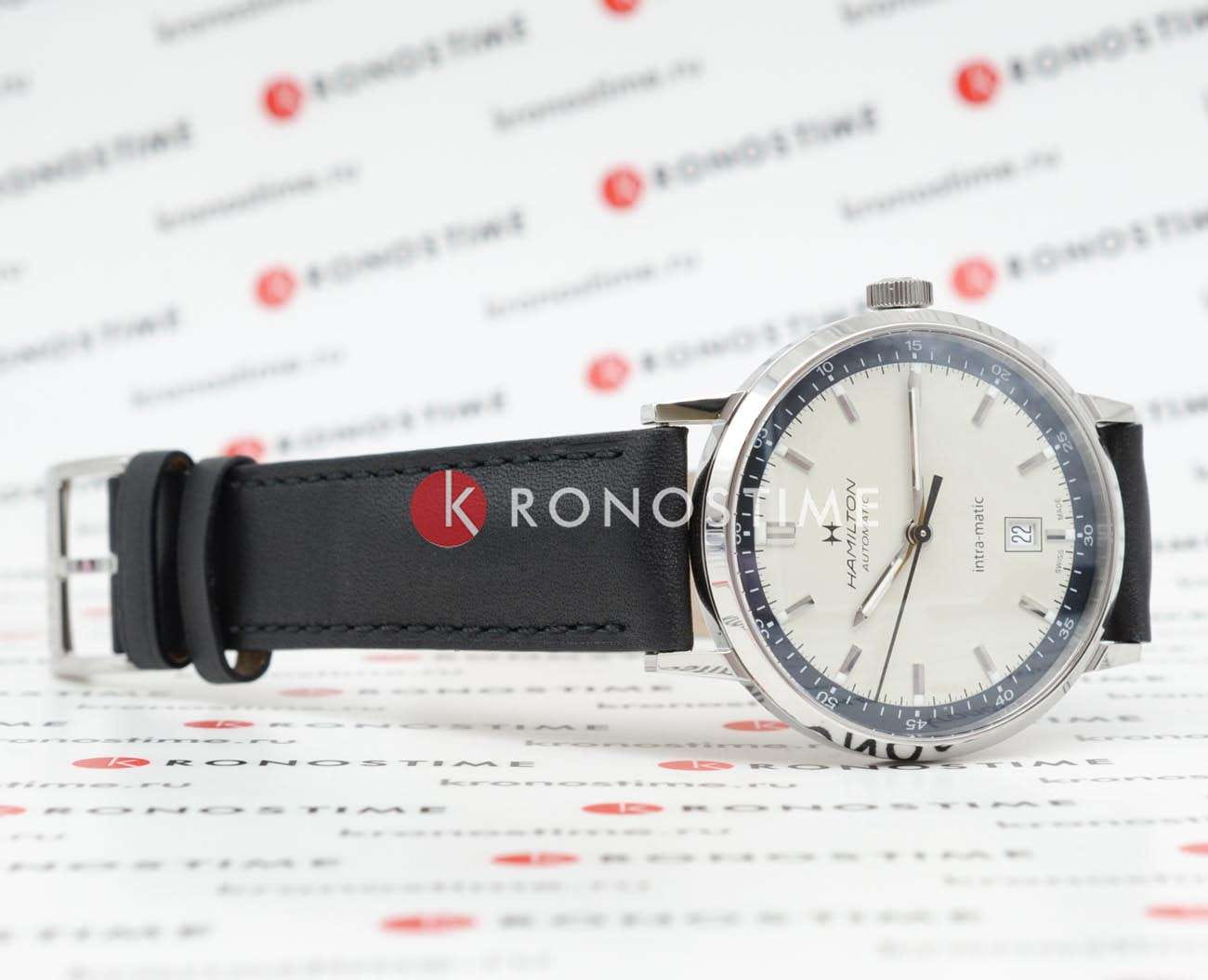 Мужские механические швейцарские часы Hamilton American Classic Intra-Matic Auto H38425720, автоматический механизм с высокой точностью. Сапфировое стеклоСапфировое стеклоПрочный и надёжный материал из кристалла сапфира синтетического происхождения, характеризующийся особой твёрдостью и устойчивостью к царапинам и повреждениям. устойчивое к появлению царапин, обладающее высокой прозрачностью. Класс водозащиты: 50 метров, позволит защитить корпус от случайных брызг или капель дождя. Корпус часов изготовлен из нержавеющей стали. Стрелки с люминесцентным покрытиемЛюминесцентное покрытиеПозволяет считывать показания времени в темноте. Производители наносят на стрелки, часовые индексы, безель или поверхность циферблата светонакопительный состав, дающий холодное свечение.. Окошко даты находится в положении шести часов. Кожаный ремешок.