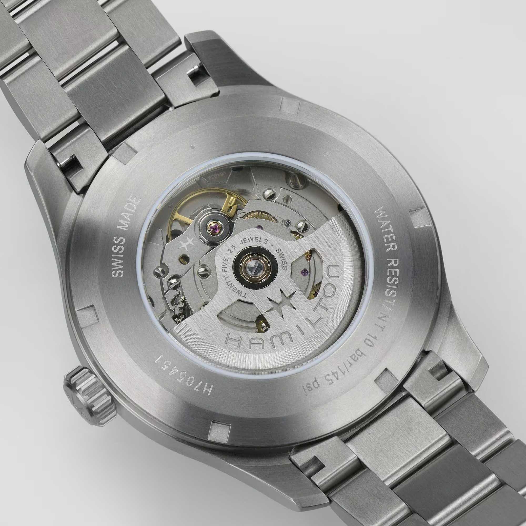 Мужские механические швейцарские часы Hamilton Khaki Field Titanium Auto H70545140, механический механизм (автоматический калибр) с высокой точностью. Сапфировое стеклоСапфировое стеклоПрочный и надёжный материал из кристалла сапфира синтетического происхождения, характеризующийся особой твёрдостью и устойчивостью к царапинам и повреждениям. устойчивое к появлению царапин, обладающее высокой прозрачностью. Класс водозащиты: 100 метров, позволит плавать, нырять и заниматься другими водными видами спорта. Корпус часов изготовлен из титана. Титановый браслет на раскладной застёжкеРаскладная застёжкаТакой тип застёжки используется только на браслетах из металла. Она никогда не раскрывается полностью, происходит разделение на 2 и более частей. Раскладывающая застёжка снизит вероятность потери часов к минимуму..