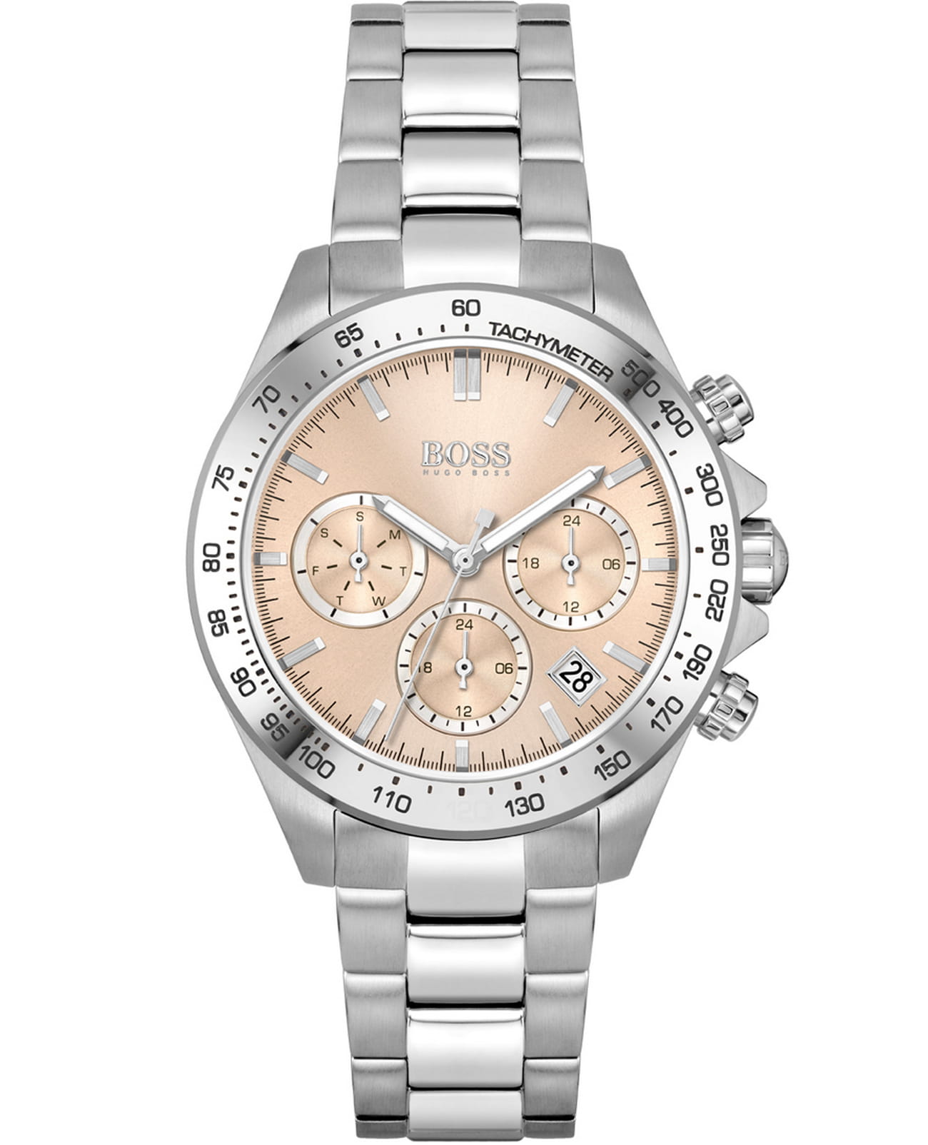 Элегантные женские часы Hugo Boss HB1502615 из коллекции Novia Sport Lux представлены в стальном корпусе диаметром 38 мм с эффектным розовым цифербалтом в технике Sunray, защищённым прочным минеральным стекломМинеральное стеклоМинеральное стекло представляет собой искусственно выращенный минерал кварца. Такое стекло отличается особой устойчивостью к повреждениям и царапинам. Уступает по некоторым качествам сапфировому стеклу.. Модель оснащена швейцарским кварцевым механизмом с полезными функциями: индикацией даты между 4 и 5 часами, вторым часовым поясомВторой часовой поясФункция, позволяющая отображать время двух часовых поясов одновременно. в 24-часовом формате и тахиметрической шкалойТахиметрРазмеченная шкала, располагается на ободке или безеле часов. Тахиметр позволяет рассчитать скорость на определённом участке пути, расстояние измеряется в километрах или милях.. Спортивный характер подчёркивает рифлёная заводная головка с защитой, а стальной браслет с раскладывающейся застёжкой обеспечивает комфортную посадку. Ударопрочная конструкцияУдаропрочный корпусМеханизм заключён в корпус, выполненный из современных материалов, устойчивых к ударам, механическим повреждениям и падению с высоты: инновационный пластик, карбон, нержавеющая сталь, титан. с водонепроницаемостью 50 метров делает часы устойчивыми к повседневным нагрузкам.