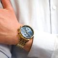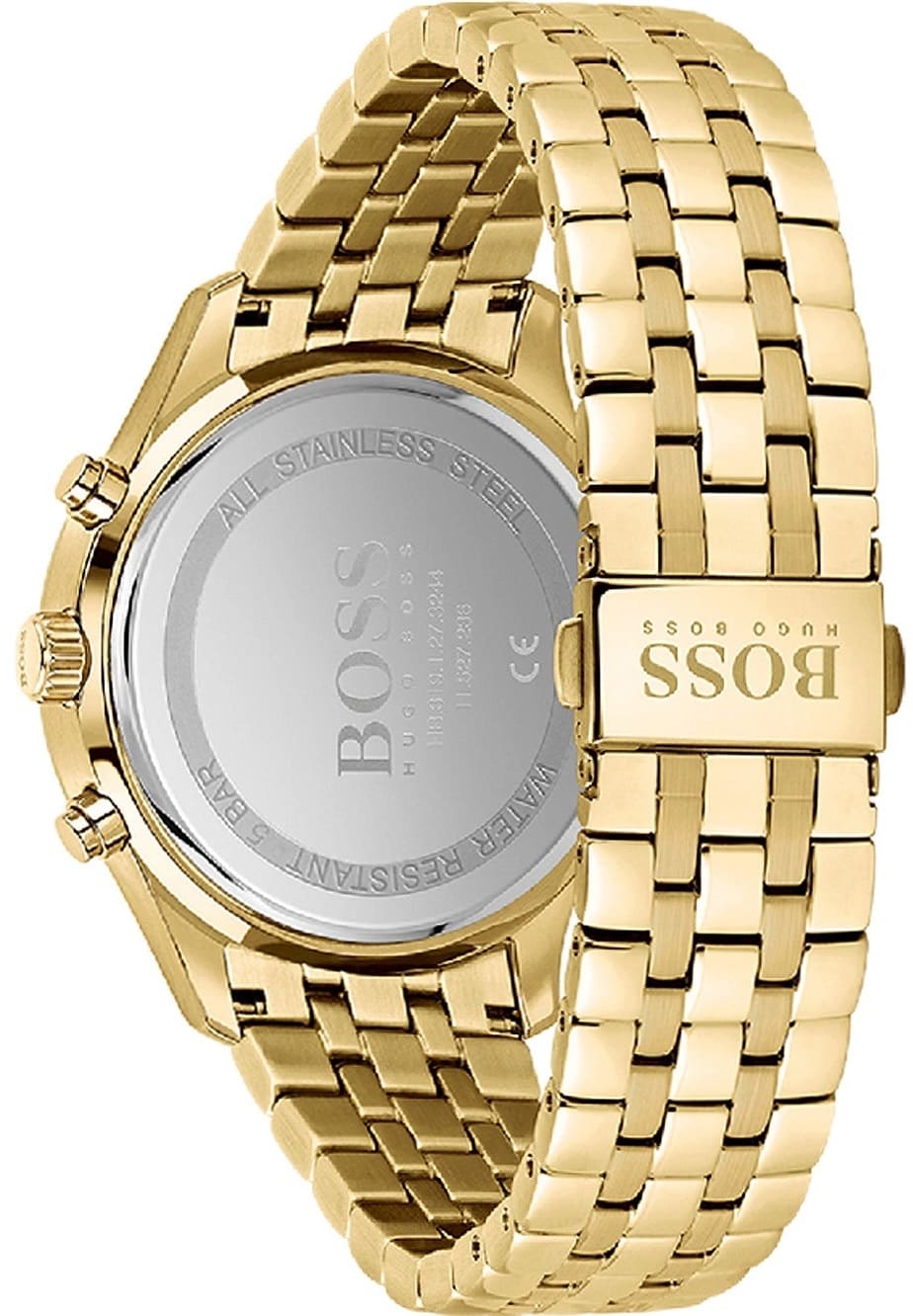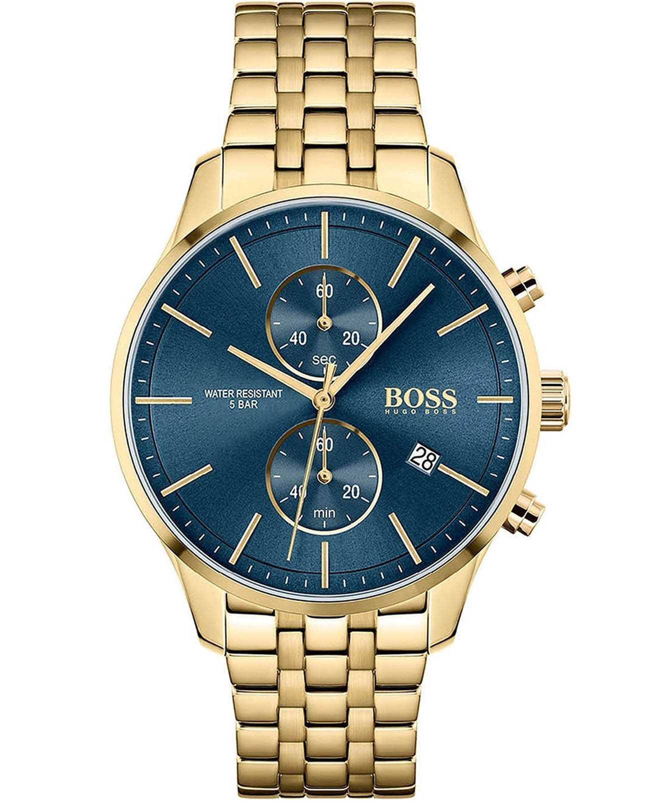 Мужские часы Hugo Boss Associate HB1513841 представлены в круглом 42-мм корпусе из нержавеющей стали с золотистым IP-покрытиемIP-покрытиеМетод ионного напыления. Демонстрирует повышенную устойчивость к истиранию, окислению и химическим веществам. Под воздействием высокого давления и температуры около 1500°C молекулы металла надёжно соединяются с частицами корпуса часов. толщиной 9,9 мм. Оснащены кварцевым механизмом с функциями хронографаХронографФункция позволяет измерять отрезки времени с особой точностью: часы, минуты, секунды. Верным признаком хронографа является наличие на циферблате 3 дополнительных окошек-счётчиков. и секундомеромСекундомерСекундоме́р — прибор, способный измерять интервалы времени с точностью до долей секунды.. Синий циферблат с эффектом солнечных лучей и окошком даты защищен устойчивым к царапинам минеральным стекломМинеральное стеклоМинеральное стекло представляет собой искусственно выращенный минерал кварца. Такое стекло отличается особой устойчивостью к повреждениям и царапинам. Уступает по некоторым качествам сапфировому стеклу.. Стальной браслет с золотистым IP-покрытиемIP-покрытиеМетод ионного напыления. Демонстрирует повышенную устойчивость к истиранию, окислению и химическим веществам. Под воздействием высокого давления и температуры около 1500°C молекулы металла надёжно соединяются с частицами корпуса часов. дополнен раскладной застёжкойРаскладная застёжкаТакой тип застёжки используется только на браслетах из металла. Она никогда не раскрывается полностью, происходит разделение на 2 и более частей. Раскладывающая застёжка снизит вероятность потери часов к минимуму. для удобной регулировки. Водонепроницаемость 50 метров (5 ATM) обеспечивает защиту от брызг воды.