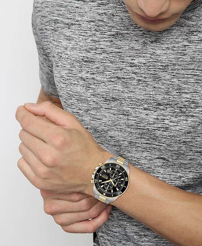 Мужские часы Hugo Boss Admiral HB1513908 представлены в круглом 45-мм корпусе из нержавеющей стали с IP-покрытиемIP-покрытиеМетод ионного напыления. Демонстрирует повышенную устойчивость к истиранию, окислению и химическим веществам. Под воздействием высокого давления и температуры около 1500°C молекулы металла надёжно соединяются с частицами корпуса часов.. Оснащены кварцевым механизмом с функциями хронографаХронографФункция позволяет измерять отрезки времени с особой точностью: часы, минуты, секунды. Верным признаком хронографа является наличие на циферблате 3 дополнительных окошек-счётчиков. и секундомеромСекундомерСекундоме́р — прибор, способный измерять интервалы времени с точностью до долей секунды.. Черный циферблат защищен устойчивым к царапинам минеральным стекломМинеральное стеклоМинеральное стекло представляет собой искусственно выращенный минерал кварца. Такое стекло отличается особой устойчивостью к повреждениям и царапинам. Уступает по некоторым качествам сапфировому стеклу.. Браслет из стали с IP-покрытиемIP-покрытиеМетод ионного напыления. Демонстрирует повышенную устойчивость к истиранию, окислению и химическим веществам. Под воздействием высокого давления и температуры около 1500°C молекулы металла надёжно соединяются с частицами корпуса часов. дополнен раскладной застёжкойРаскладная застёжкаТакой тип застёжки используется только на браслетах из металла. Она никогда не раскрывается полностью, происходит разделение на 2 и более частей. Раскладывающая застёжка снизит вероятность потери часов к минимуму., а стрелки покрыты люминесцентным составомЛюминесцентное покрытиеПозволяет считывать показания времени в темноте. Производители наносят на стрелки, часовые индексы, безель или поверхность циферблата светонакопительный состав, дающий холодное свечение. для видимости в темноте. Водонепроницаемость 100 метров (10 ATM) позволяет использовать часы для плавания.