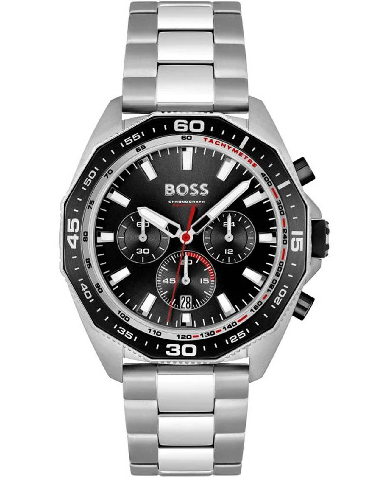 Мужские часы Hugo Boss Energy HB1513971 представлены в круглом 44-мм корпусе из нержавеющей стали с частичным IP-покрытиемIP-покрытиеМетод ионного напыления. Демонстрирует повышенную устойчивость к истиранию, окислению и химическим веществам. Под воздействием высокого давления и температуры около 1500°C молекулы металла надёжно соединяются с частицами корпуса часов.. Оснащены кварцевым механизмом с функциями хронографаХронографФункция позволяет измерять отрезки времени с особой точностью: часы, минуты, секунды. Верным признаком хронографа является наличие на циферблате 3 дополнительных окошек-счётчиков., секундомеромСекундомерСекундоме́р — прибор, способный измерять интервалы времени с точностью до долей секунды. и тахиметромТахиметрРазмеченная шкала, располагается на ободке или безеле часов. Тахиметр позволяет рассчитать скорость на определённом участке пути, расстояние измеряется в километрах или милях. на безелеБезельВнешний ободок, закрепляющий стекло. В спортивных часах так называется поворотное кольцо с делениями на циферблате, выполняет роль таймера – замеряет отрезки времени на шкале. Неподвижный безель – элемент декора. Однонаправленно вращающийся безель на дайверских часах позволяет фиксировать моменты погружения и выныривания на поверхность.. Черный циферблат защищен устойчивым к царапинам минеральным стекломМинеральное стеклоМинеральное стекло представляет собой искусственно выращенный минерал кварца. Такое стекло отличается особой устойчивостью к повреждениям и царапинам. Уступает по некоторым качествам сапфировому стеклу.. Браслет из нержавеющей стали дополнен раскладной застёжкойРаскладная застёжкаТакой тип застёжки используется только на браслетах из металла. Она никогда не раскрывается полностью, происходит разделение на 2 и более частей. Раскладывающая застёжка снизит вероятность потери часов к минимуму., а стрелки покрыты люминесцентным составомЛюминесцентное покрытиеПозволяет считывать показания времени в темноте. Производители наносят на стрелки, часовые индексы, безель или поверхность циферблата светонакопительный состав, дающий холодное свечение. для видимости в темноте. Водонепроницаемость 50 метров (5 ATM) позволяет использовать часы для плавания.