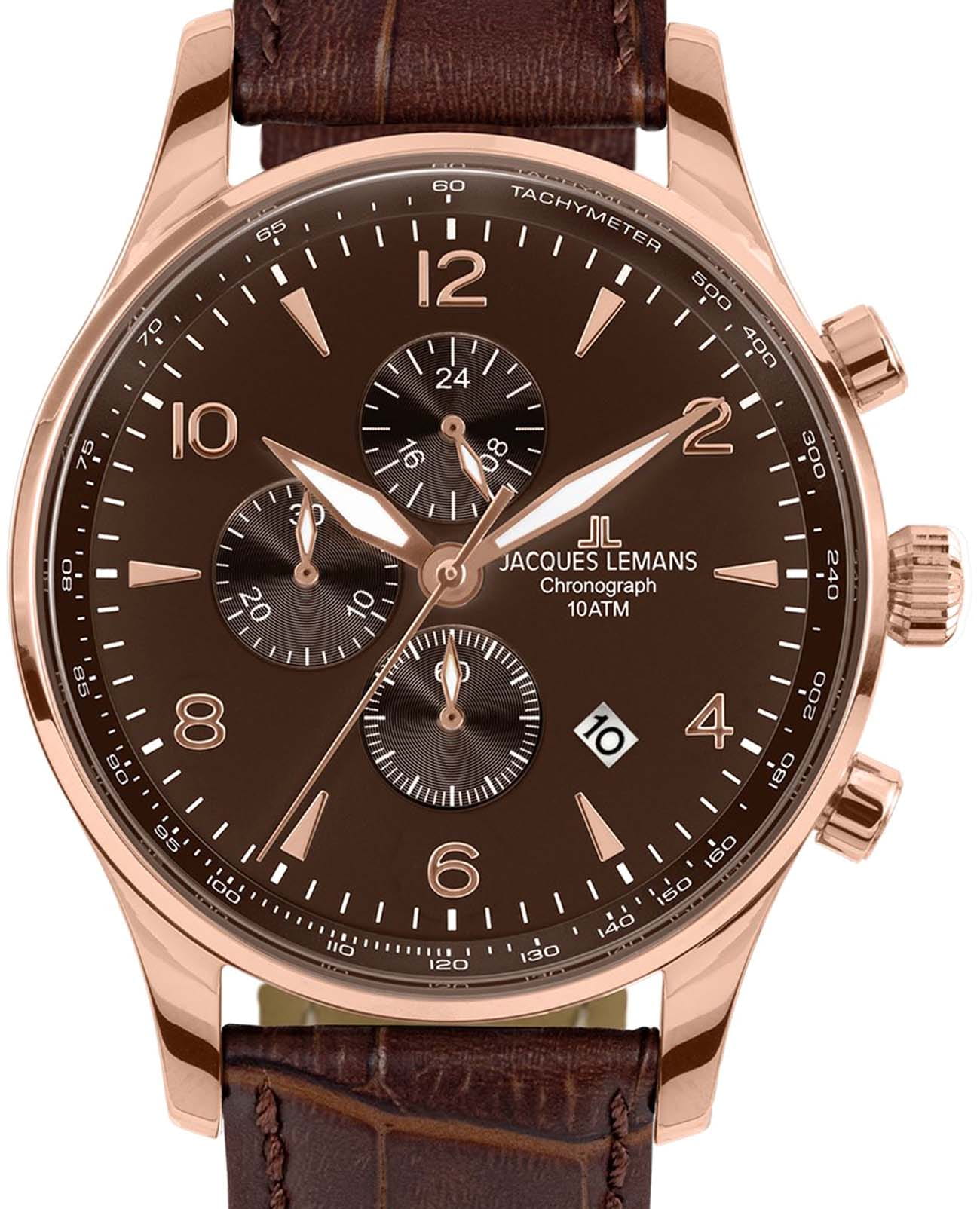 Мужские часы Jacques Lemans London 1-1844ZQ представляют собой стильный хронографХронографФункция позволяет измерять отрезки времени с особой точностью: часы, минуты, секунды. Верным признаком хронографа является наличие на циферблате 3 дополнительных окошек-счётчиков., отражающий идеальное сочетание современного дизайна, надёжности и функциональности. Элегантный облик позволяют носить часы как со строгой рубашкой, так и с повседневными джинсами. Корпус из нержавеющей стали с PVD-покрытиемPVDУльтратонкое покрытие наносится в технике вакуумного напыления, сочетает в себе нитрид титана особой прочности со слоем золота или оксида хрома. Несёт в себе декоративную или защитную функцию. цвета розового золота, диаметром 44 мм идеально сбалансирован и элегантен. Ударопрочное минеральное стеклоМинеральное стеклоМинеральное стекло представляет собой искусственно выращенный минерал кварца. Такое стекло отличается особой устойчивостью к повреждениям и царапинам. Уступает по некоторым качествам сапфировому стеклу. Crystex защищает циферблат от царапин. Кожаный ремешок на стандартной застёжке обеспечивает комфортное ношение. ТахиметрТахиметрРазмеченная шкала, располагается на ободке или безеле часов. Тахиметр позволяет рассчитать скорость на определённом участке пути, расстояние измеряется в километрах или милях. по внешнему краю. Водозащита 100 метров позволит плавать, нырять и заниматься другими водными видами спорта. Стрелки с люминесцентным покрытиемЛюминесцентное покрытиеПозволяет считывать показания времени в темноте. Производители наносят на стрелки, часовые индексы, безель или поверхность циферблата светонакопительный состав, дающий холодное свечение. позволяющие легко определять время даже в темноте. Окошко даты находится в положении между 4 и 5 часов. Это аксессуар для мужчины, который ценит классический стиль и функциональность.