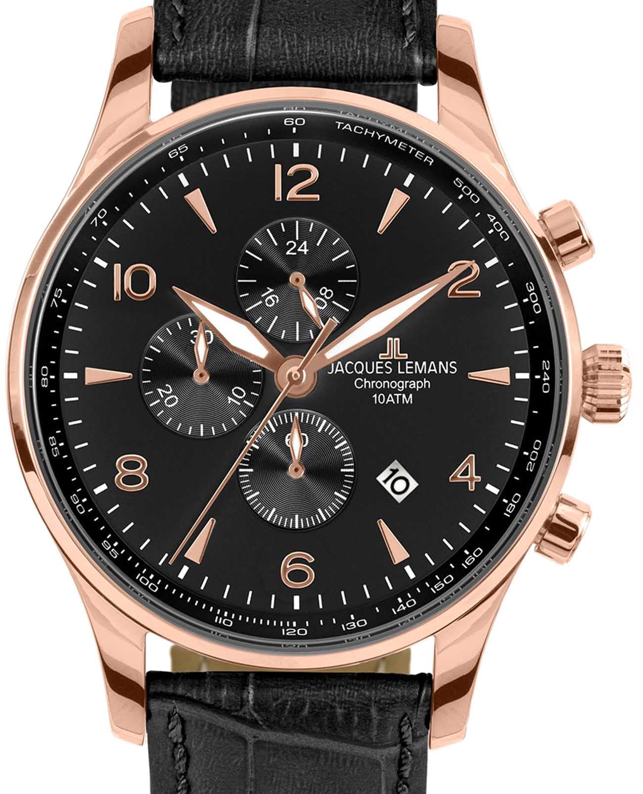 Мужские часы Jacques Lemans London 1-1844ZS представляют собой стильный хронографХронографФункция позволяет измерять отрезки времени с особой точностью: часы, минуты, секунды. Верным признаком хронографа является наличие на циферблате 3 дополнительных окошек-счётчиков., отражающий идеальное сочетание современного дизайна, надёжности и функциональности. Элегантный облик позволяют носить часы как со строгой рубашкой, так и с повседневными джинсами. Корпус из нержавеющей стали с PVD-покрытиемPVDУльтратонкое покрытие наносится в технике вакуумного напыления, сочетает в себе нитрид титана особой прочности со слоем золота или оксида хрома. Несёт в себе декоративную или защитную функцию. цвета розового золота, диаметром 44 мм идеально сбалансирован и элегантен. Ударопрочное минеральное стеклоМинеральное стеклоМинеральное стекло представляет собой искусственно выращенный минерал кварца. Такое стекло отличается особой устойчивостью к повреждениям и царапинам. Уступает по некоторым качествам сапфировому стеклу. Crystex защищает циферблат от царапин. Кожаный ремешок на стандартной застёжке обеспечивает комфортное ношение. ТахиметрТахиметрРазмеченная шкала, располагается на ободке или безеле часов. Тахиметр позволяет рассчитать скорость на определённом участке пути, расстояние измеряется в километрах или милях. по внешнему краю. Водозащита 100 метров позволит плавать, нырять и заниматься другими водными видами спорта. Стрелки с люминесцентным покрытиемЛюминесцентное покрытиеПозволяет считывать показания времени в темноте. Производители наносят на стрелки, часовые индексы, безель или поверхность циферблата светонакопительный состав, дающий холодное свечение. позволяющие легко определять время даже в темноте. Окошко даты находится в положении между 4 и 5 часов. Это аксессуар для мужчины, который ценит классический стиль и функциональность.