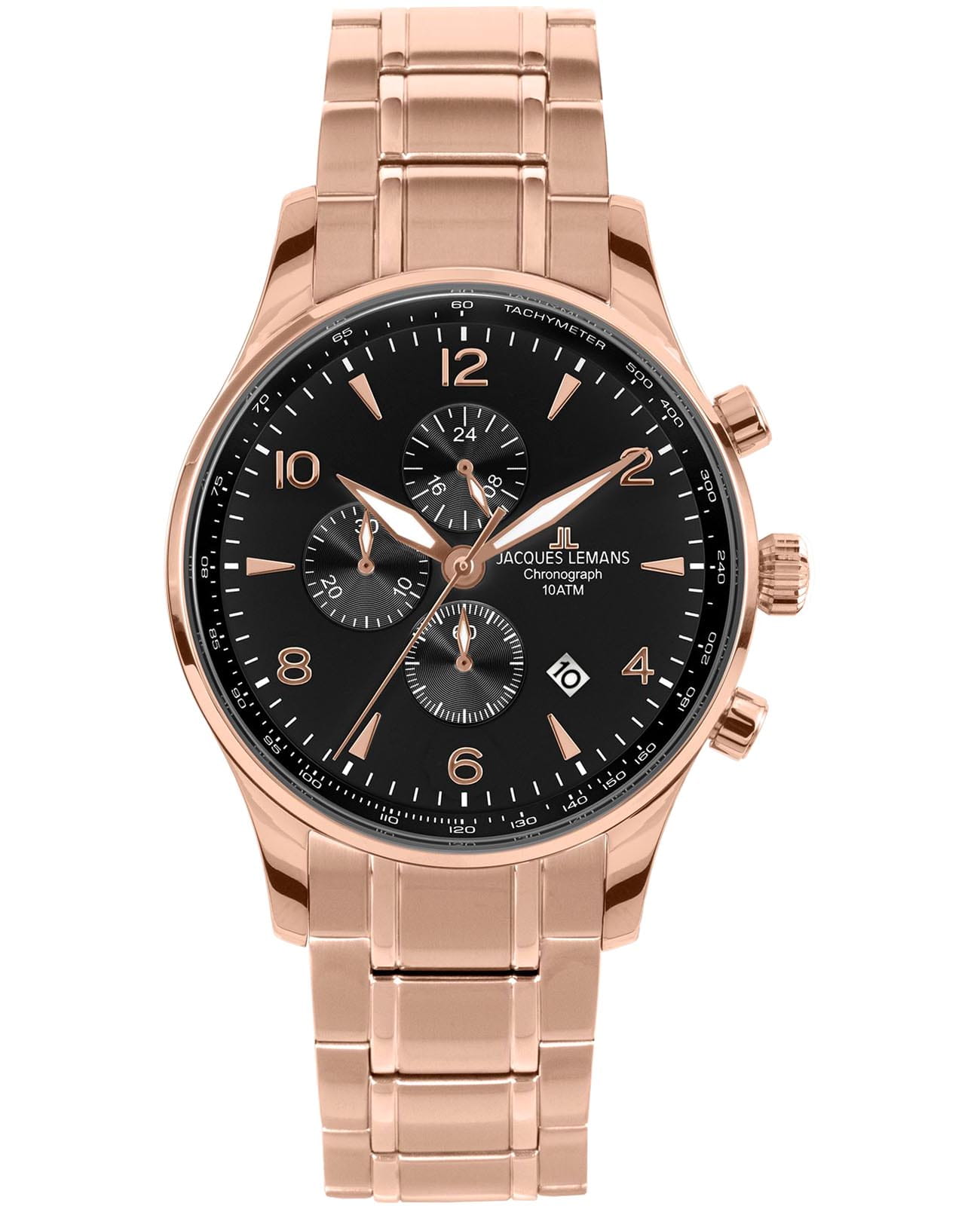 Мужские часы Jacques Lemans London 1-1844ZT представляют собой стильный хронографХронографФункция позволяет измерять отрезки времени с особой точностью: часы, минуты, секунды. Верным признаком хронографа является наличие на циферблате 3 дополнительных окошек-счётчиков., отражающий идеальное сочетание современного дизайна, надёжности и функциональности. Элегантный облик позволяют носить часы как со строгой рубашкой, так и с повседневными джинсами. Корпус из нержавеющей стали с PVD-покрытиемPVDУльтратонкое покрытие наносится в технике вакуумного напыления, сочетает в себе нитрид титана особой прочности со слоем золота или оксида хрома. Несёт в себе декоративную или защитную функцию. цвета розового золота, диаметром 44 мм идеально сбалансирован и элегантен. Ударопрочное минеральное стеклоМинеральное стеклоМинеральное стекло представляет собой искусственно выращенный минерал кварца. Такое стекло отличается особой устойчивостью к повреждениям и царапинам. Уступает по некоторым качествам сапфировому стеклу. Crystex защищает циферблат от царапин. Стальной браслет на раскладной застёжке с фиксаторомРаскладная застёжкаТакой тип застёжки используется только на браслетах из металла. Она никогда не раскрывается полностью, происходит разделение на 2 и более частей. Раскладывающая застёжка снизит вероятность потери часов к минимуму. обеспечивает комфортное ношение. ТахиметрТахиметрРазмеченная шкала, располагается на ободке или безеле часов. Тахиметр позволяет рассчитать скорость на определённом участке пути, расстояние измеряется в километрах или милях. по внешнему краю. Водозащита 100 метров позволит плавать, нырять и заниматься другими водными видами спорта. Стрелки с люминесцентным покрытиемЛюминесцентное покрытиеПозволяет считывать показания времени в темноте. Производители наносят на стрелки, часовые индексы, безель или поверхность циферблата светонакопительный состав, дающий холодное свечение. позволяют легко определять время даже в темноте. Окошко даты находится в положении между 4 и 5 часов. Это аксессуар для мужчины, который ценит классический стиль и функциональность.