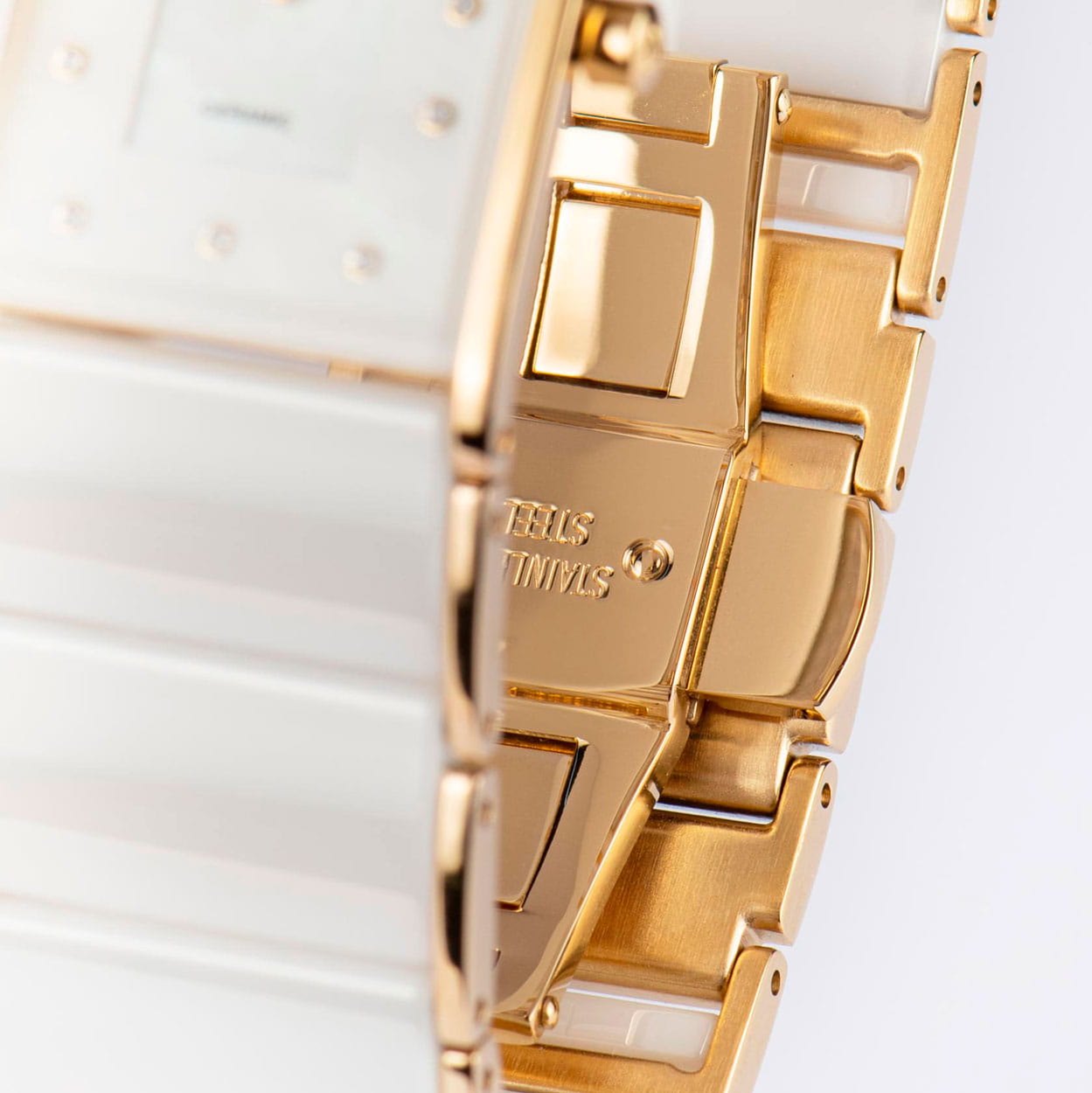 Элегантная женская модель с кварцевым механизмом. Тонкий корпус из нержавеющей стали диаметром 24 х 28 мм дополнен зеркальной полировкой. Объемный циферблат выполнен из натурального перламутра. В роли маркеров выступают кристаллы Swarovski. В часах установлено минеральное стеклоМинеральное стеклоМинеральное стекло представляет собой искусственно выращенный минерал кварца. Такое стекло отличается особой устойчивостью к повреждениям и царапинам. Уступает по некоторым качествам сапфировому стеклу. с сапфировым напылением. Водонепроницаемость составляет 5 атмосфер. Звенья браслета сделаны из керамики – материала, обладающего естественным блеском и способностью противостоять появлению микроцарапин. Застёжка «бабочка» с кнопкамиЗастёжка "бабочка"Такой вид застёжки дополняется предохранителями, помогающими избежать случайного раскрытия браслета. Обладают изящным исполнением. обеспечивает надежность. Часы High Tech Ceramic — статусный аксессуар, который подчеркнет ваше утонченное чувство стиля.
