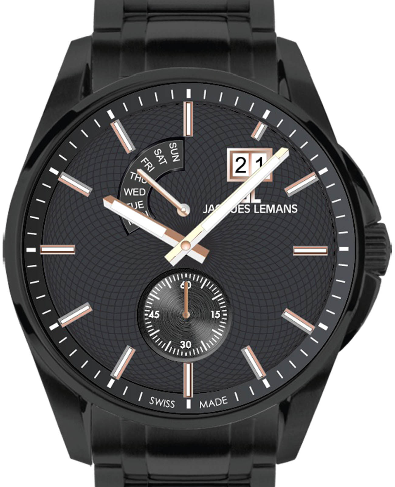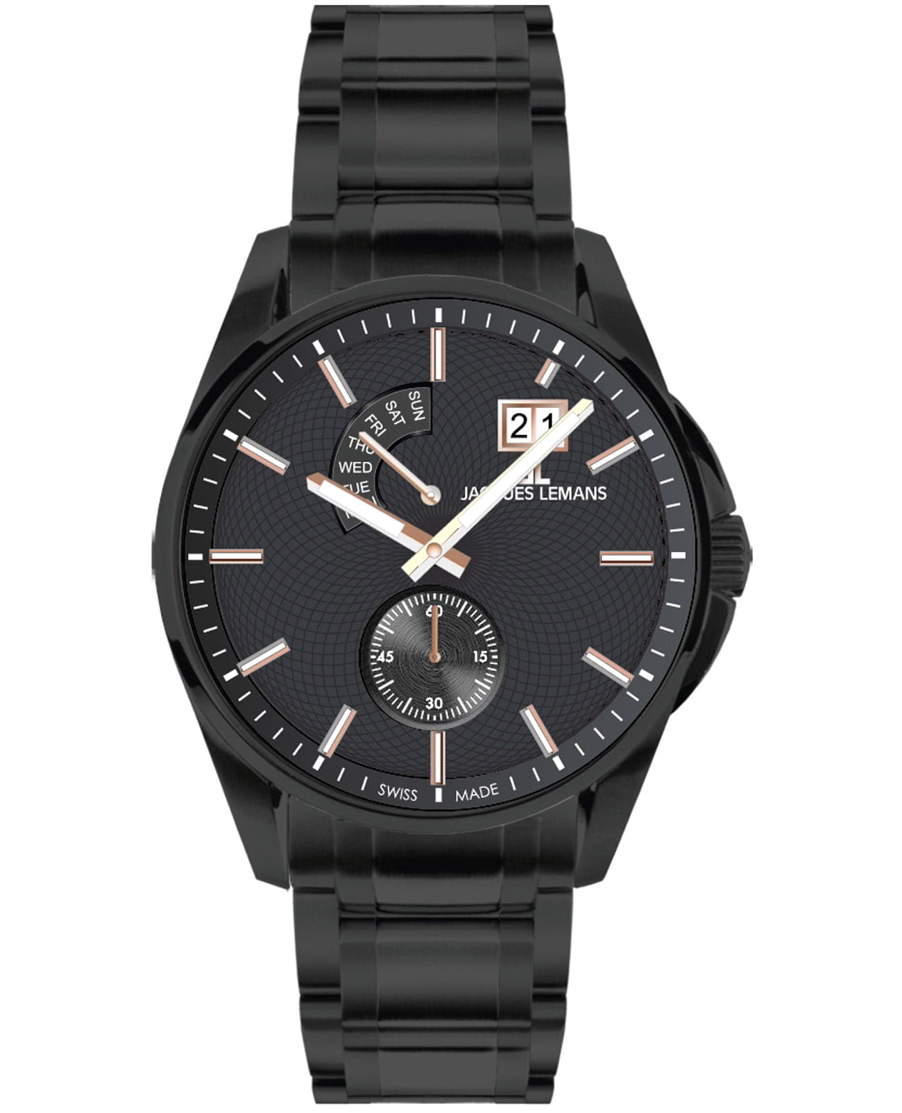 Мужские часы Jacques Lemans 1-2199V – лаконичная красота и изысканная элегантность. Оригинальная модель с классическим оформлением станет превосходным завершением образа, наделив его индивидуальным характером. Корпус выполнен из нержавеющей стали с PVD-покрытиемPVDУльтратонкое покрытие наносится в технике вакуумного напыления, сочетает в себе нитрид титана особой прочности со слоем золота или оксида хрома. Несёт в себе декоративную или защитную функцию. черного цвета, диаметром 44 мм, что обеспечивает долговечность и утончённый внешний вид. Минеральное стеклоМинеральное стеклоМинеральное стекло представляет собой искусственно выращенный минерал кварца. Такое стекло отличается особой устойчивостью к повреждениям и царапинам. Уступает по некоторым качествам сапфировому стеклу. с сапфировым напылением защищает циферблат от царапин. Окошко даты находится в положении 1 час. Широкое окошко дня недели в положении 11-12 часов позволяет показывать название дня недели. Стальной браслет с PVD-покрытиемPVDУльтратонкое покрытие наносится в технике вакуумного напыления, сочетает в себе нитрид титана особой прочности со слоем золота или оксида хрома. Несёт в себе декоративную или защитную функцию. на раскладной застёжкеРаскладная застёжкаТакой тип застёжки используется только на браслетах из металла. Она никогда не раскрывается полностью, происходит разделение на 2 и более частей. Раскладывающая застёжка снизит вероятность потери часов к минимуму. обеспечивает комфортное ношение. Водозащита 100 метров позволит плавать, нырять и заниматься другими водными видами спорта. Стрелки и метки с люминесцентным покрытиемЛюминесцентное покрытиеПозволяет считывать показания времени в темноте. Производители наносят на стрелки, часовые индексы, безель или поверхность циферблата светонакопительный состав, дающий холодное свечение. позволяющие легко определять время даже в темноте. Это аксессуар для мужчины, который ценит классический стиль и функциональность.