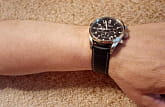 Кварцевый хронограф с отображением даты. Класс водозащиты 10атм.(до 100м.) Кожаный ремешок с белой строчкой.