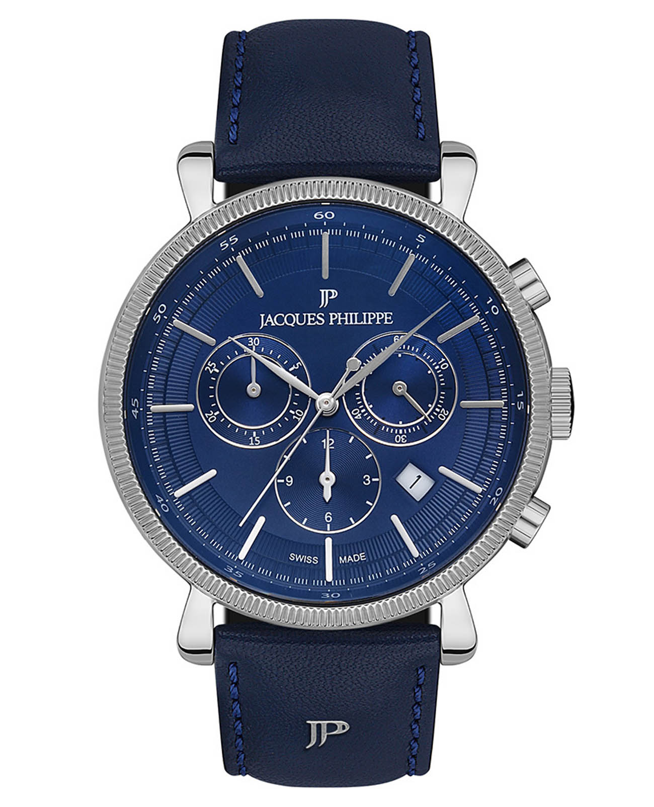 Швейцарские мужские часы-хронографХронографФункция позволяет измерять отрезки времени с особой точностью: часы, минуты, секунды. Верным признаком хронографа является наличие на циферблате 3 дополнительных окошек-счётчиков. с секундомеромСекундомерСекундоме́р — прибор, способный измерять интервалы времени с точностью до долей секунды. Jacques Philippe Vintage JPQGC191132, кварцевый механизм с высокой точностью. Сапфировое стеклоСапфировое стеклоПрочный и надёжный материал из кристалла сапфира синтетического происхождения, характеризующийся особой твёрдостью и устойчивостью к царапинам и повреждениям. устойчивое к появлению царапин, обладающее высокой прозрачностью. Корпус часов изготовлен из нержавеющей стали. На циферблате три дополнительных индикатора. Окошко даты находится между 4 и 5 часами. Класс водозащиты: 50 метров, позволит защитить корпус от случайных брызг или капель дождя. Кожаный ремешок на стандартной застёжке.