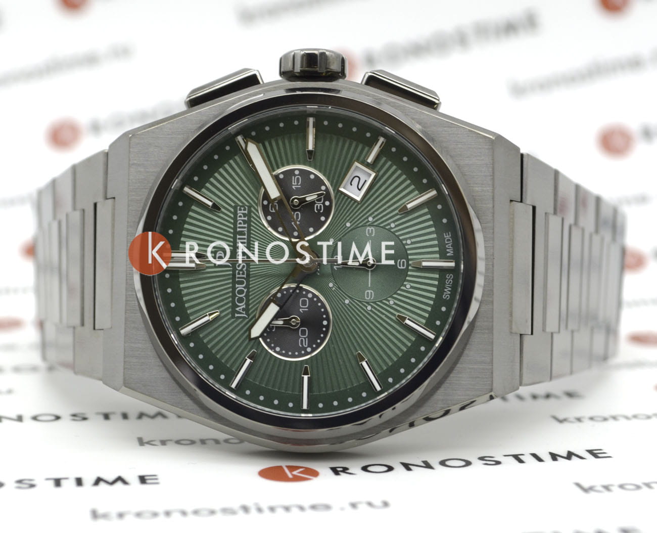 Швейцарские мужские часы-хронографХронографФункция позволяет измерять отрезки времени с особой точностью: часы, минуты, секунды. Верным признаком хронографа является наличие на циферблате 3 дополнительных окошек-счётчиков. с секундомеромСекундомерСекундоме́р — прибор, способный измерять интервалы времени с точностью до долей секунды. Jacques Philippe Aurora JPQGC4183X7, кварцевый механизм с высокой точностью. Сапфировое стеклоСапфировое стеклоПрочный и надёжный материал из кристалла сапфира синтетического происхождения, характеризующийся особой твёрдостью и устойчивостью к царапинам и повреждениям. устойчивое к появлению царапин, обладающее высокой прозрачностью. Корпус часов изготовлен из нержавеющей стали с IP-покрытиемIP-покрытиеМетод ионного напыления. Демонстрирует повышенную устойчивость к истиранию, окислению и химическим веществам. Под воздействием высокого давления и температуры около 1500°C молекулы металла надёжно соединяются с частицами корпуса часов.. На циферблате три дополнительных индикатора. Окошко даты находится в положении 4 часа. Стрелки с люминесцентным покрытиемЛюминесцентное покрытиеПозволяет считывать показания времени в темноте. Производители наносят на стрелки, часовые индексы, безель или поверхность циферблата светонакопительный состав, дающий холодное свечение.. Класс водозащиты: 50 метров, позволит защитить корпус от случайных брызг или капель дождя. Стальной браслет с IP-покрытиемIP-покрытиеМетод ионного напыления. Демонстрирует повышенную устойчивость к истиранию, окислению и химическим веществам. Под воздействием высокого давления и температуры около 1500°C молекулы металла надёжно соединяются с частицами корпуса часов. на застёжке «бабочка» с кнопкамиЗастёжка "бабочка"Такой вид застёжки дополняется предохранителями, помогающими избежать случайного раскрытия браслета. Обладают изящным исполнением. .