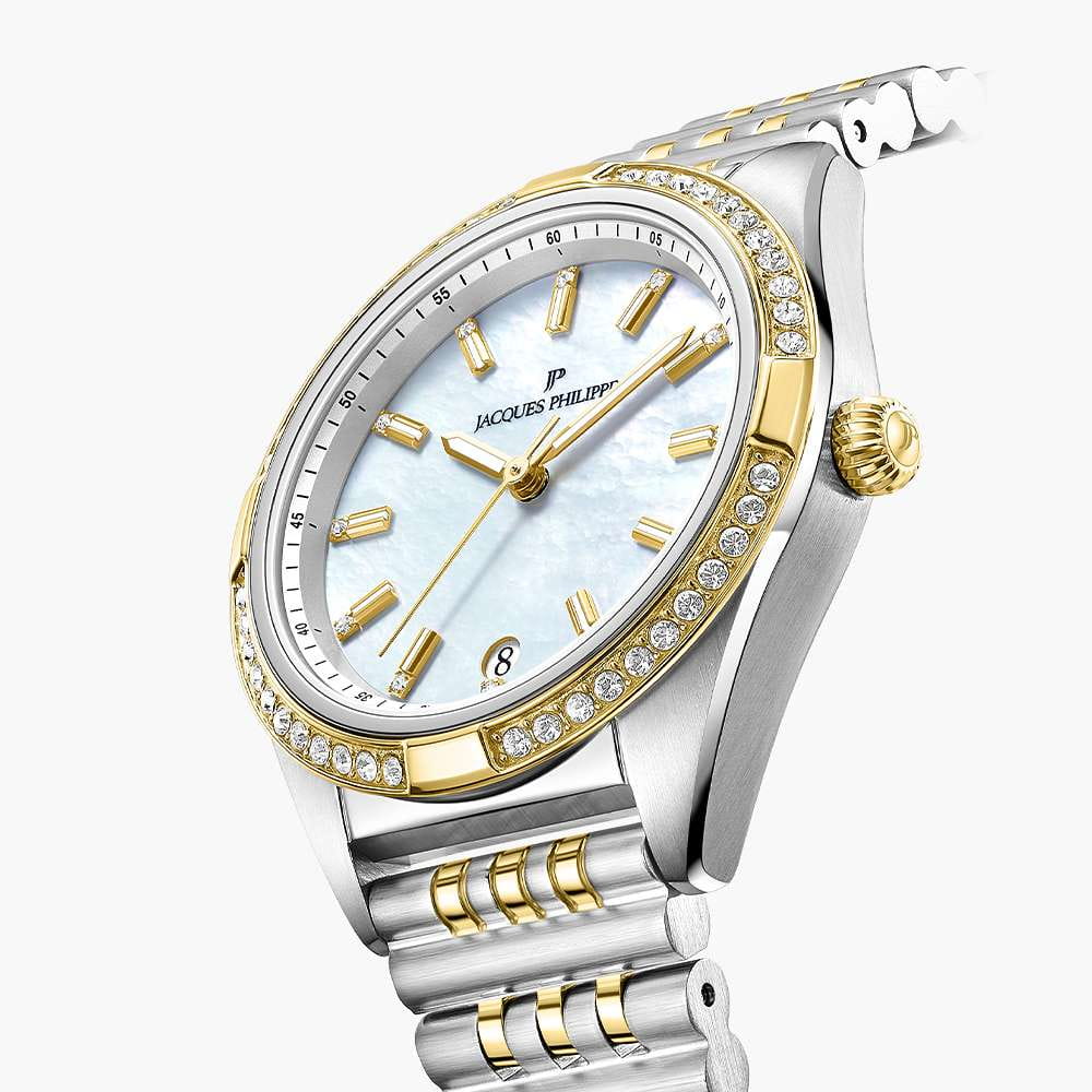 Jacques Philippe Radiante JPQLS687388YG — изящная женская модель коллекции Radiante с кварцевым механизмом, сочетающая классический стиль и практичность. Корпус диаметром 33 мм выполнен из нержавеющей стали и полированными поверхностями, безельБезельВнешний ободок, закрепляющий стекло. В спортивных часах так называется поворотное кольцо с делениями на циферблате, выполняет роль таймера – замеряет отрезки времени на шкале. Неподвижный безель – элемент декора. Однонаправленно вращающийся безель на дайверских часах позволяет фиксировать моменты погружения и выныривания на поверхность. с PVDPVDУльтратонкое покрытие наносится в технике вакуумного напыления, сочетает в себе нитрид титана особой прочности со слоем золота или оксида хрома. Несёт в себе декоративную или защитную функцию. инкрустирован кристаллами, что придаёт часам утончённый блеск. Водозащита до 5 атм (50 м) позволяет носить модель в повседневных условиях. Выпуклое сапфировое стеклоСапфировое стеклоПрочный и надёжный материал из кристалла сапфира синтетического происхождения, характеризующийся особой твёрдостью и устойчивостью к царапинам и повреждениям. обеспечивает защиту от царапин и сохраняет высокую прозрачность, делая циферблат легко читаемым. Модель оснащена точным швейцарским кварцевым механизмом с индикацией часов, минут и секунд. Циферблат оформлен в лаконичном стиле с аккуратными метками, а браслет из нержавеющей стали с частичным PVDPVDУльтратонкое покрытие наносится в технике вакуумного напыления, сочетает в себе нитрид титана особой прочности со слоем золота или оксида хрома. Несёт в себе декоративную или защитную функцию.-покрытием гармонично завершает образ, подчёркивая универсальность и элегантность этих часов.