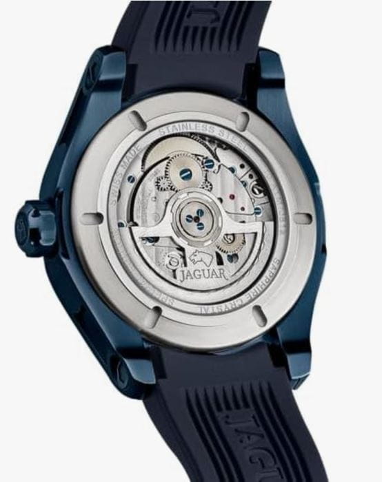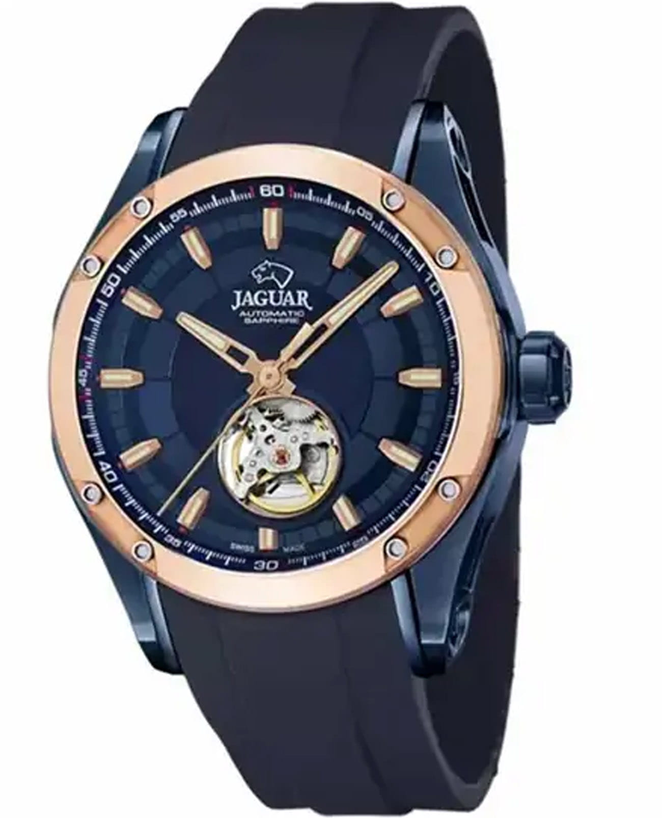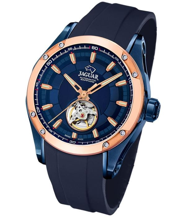 Мужские швейцарские часы Jaguar Ouverture J812/1 с механическим механизмом с автоподзаводом. Сапфировое стеклоСапфировое стеклоПрочный и надёжный материал из кристалла сапфира синтетического происхождения, характеризующийся особой твёрдостью и устойчивостью к царапинам и повреждениям. устойчивое к мелким механическим повреждениям. Корпус часов изготовлен из нержавеющей стали с PVD-покрытиемPVDУльтратонкое покрытие наносится в технике вакуумного напыления, сочетает в себе нитрид титана особой прочности со слоем золота или оксида хрома. Несёт в себе декоративную или защитную функцию.. Стрелки и метки с люминесцентным покрытиемЛюминесцентное покрытиеПозволяет считывать показания времени в темноте. Производители наносят на стрелки, часовые индексы, безель или поверхность циферблата светонакопительный состав, дающий холодное свечение.. Класс водозащиты: 100 метров, позволит плавать, нырять и заниматься другими водными видами спорта. Стильныйй каучуковый ремешок на стандартной застёжке. БезельБезельВнешний ободок, закрепляющий стекло. В спортивных часах так называется поворотное кольцо с делениями на циферблате, выполняет роль таймера – замеряет отрезки времени на шкале. Неподвижный безель – элемент декора. Однонаправленно вращающийся безель на дайверских часах позволяет фиксировать моменты погружения и выныривания на поверхность. с золотистым PVD-покрытиемPVDУльтратонкое покрытие наносится в технике вакуумного напыления, сочетает в себе нитрид титана особой прочности со слоем золота или оксида хрома. Несёт в себе декоративную или защитную функцию.. Jaguar Ouverture J812/1 — идеальный выбор для мужчин, которые ценят швейцарское качество и современные технологии.