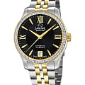 Женские швейцарские часы Jaguar Automatic Woman J998/2, механизм — автоподзавод. В часах с автоподзаводом заводная головка практически не используется, что исключает истирание ее материала и материала корпуса. Сапфировое стеклоСапфировое стеклоПрочный и надёжный материал из кристалла сапфира синтетического происхождения, характеризующийся особой твёрдостью и устойчивостью к царапинам и повреждениям. устойчивое к мелким механическим повреждениям. Корпус и браслет часов изготовлены из нержавеющей стали. Окошко даты находится в положении 6 часов. Класс водозащиты: 50 метров, позволит защитить корпус от случайных брызг или капель дождя. Стальной браслет с частичным  PVD-покрытиемPVDУльтратонкое покрытие наносится в технике вакуумного напыления, сочетает в себе нитрид титана особой прочности со слоем золота или оксида хрома. Несёт в себе декоративную или защитную функцию. на застёжке-бабочке с кнопкамиЗастёжка "бабочка"Такой вид застёжки дополняется предохранителями, помогающими избежать случайного раскрытия браслета. Обладают изящным исполнением. . БезельБезельВнешний ободок, закрепляющий стекло. В спортивных часах так называется поворотное кольцо с делениями на циферблате, выполняет роль таймера – замеряет отрезки времени на шкале. Неподвижный безель – элемент декора. Однонаправленно вращающийся безель на дайверских часах позволяет фиксировать моменты погружения и выныривания на поверхность. с PVD-покрытиемPVDУльтратонкое покрытие наносится в технике вакуумного напыления, сочетает в себе нитрид титана особой прочности со слоем золота или оксида хрома. Несёт в себе декоративную или защитную функцию. инкрустирован цирконием.