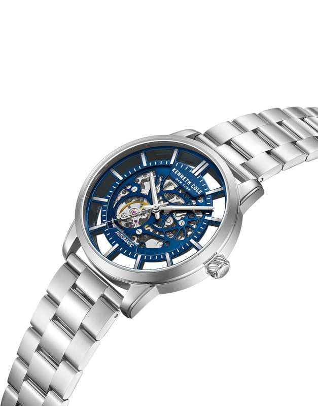 Kenneth Cole KCWGY0064302 — мужская автоматическая модель с эффектным современным дизайном и открытым скелетонизированным циферблатом. Корпус выполнен из нержавеющей стали и дополнен металлическим браслетом, который обеспечивает комфортное прилегание на раскладной застёжкеРаскладная застёжкаТакой тип застёжки используется только на браслетах из металла. Она никогда не раскрывается полностью, происходит разделение на 2 и более частей. Раскладывающая застёжка снизит вероятность потери часов к минимуму. для удобной фиксации. Конструкция циферблата открывает вид на работу автоматического механизма, позволяя наблюдать за его движением. Cтрелки покрыты люминесцентным покрытиемЛюминесцентное покрытиеПозволяет считывать показания времени в темноте. Производители наносят на стрелки, часовые индексы, безель или поверхность циферблата светонакопительный состав, дающий холодное свечение. для читаемости в условиях недостаточного освещения. Защитную функцию выполняет минеральное стеклоМинеральное стеклоМинеральное стекло представляет собой искусственно выращенный минерал кварца. Такое стекло отличается особой устойчивостью к повреждениям и царапинам. Уступает по некоторым качествам сапфировому стеклу., устойчивое к повседневным повреждениям. Водозащита 3 ATM защищает модель от случайных брызг и дождя.