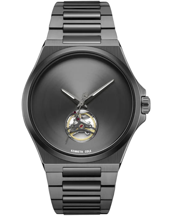 Kenneth Cole KCWGY0067405 — мужская автоматическая модель с современным минималистичным дизайном и акцентом на архитектурные линии. Корпус и браслет выполнены из нержавеющей стали с тёмным PVDPVDУльтратонкое покрытие наносится в технике вакуумного напыления, сочетает в себе нитрид титана особой прочности со слоем золота или оксида хрома. Несёт в себе декоративную или защитную функцию.-покрытием, что придаёт часам стильный и строгий облик. В центре внимания — циферблат с открытым окном, через которое можно наблюдать за работой автоматического механизма. Стрелки покрыты люминесцентным покрытиемЛюминесцентное покрытиеПозволяет считывать показания времени в темноте. Производители наносят на стрелки, часовые индексы, безель или поверхность циферблата светонакопительный состав, дающий холодное свечение., обеспечивающим читаемость в условиях слабого освещения. Защиту конструкции выполняет минеральное стеклоМинеральное стеклоМинеральное стекло представляет собой искусственно выращенный минерал кварца. Такое стекло отличается особой устойчивостью к повреждениям и царапинам. Уступает по некоторым качествам сапфировому стеклу., устойчивое к повседневным повреждениям. Браслет оснащён раскладной застёжкойРаскладная застёжкаТакой тип застёжки используется только на браслетах из металла. Она никогда не раскрывается полностью, происходит разделение на 2 и более частей. Раскладывающая застёжка снизит вероятность потери часов к минимуму., гарантирующей удобство фиксации и надёжность при носке. Модель сочетает техническую эстетику сквозного механизма и современный характер, подчёркивая индивидуальность владельца.