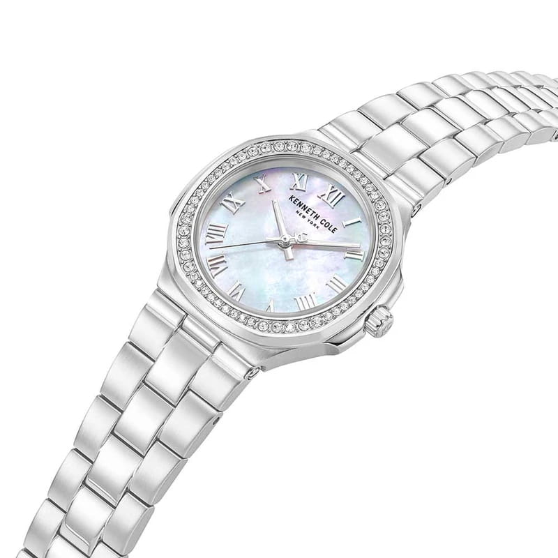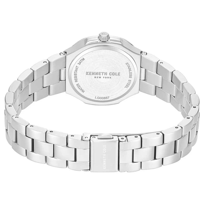 Женские кварцевые часы Kenneth Cole — это элегантный и выразительный аксессуар. Корпус диаметром 33 мм выполнен из нержавеющей стали 316L. Циферблат светло-перламутрового цвета оформлен индексами и украшен цирконами. Циферблат защищён минеральным стекломМинеральное стеклоМинеральное стекло представляет собой искусственно выращенный минерал кварца. Такое стекло отличается особой устойчивостью к повреждениям и царапинам. Уступает по некоторым качествам сапфировому стеклу.. Часы оснащены стальным браслетом на раскладной застёжкеРаскладная застёжкаТакой тип застёжки используется только на браслетах из металла. Она никогда не раскрывается полностью, происходит разделение на 2 и более частей. Раскладывающая застёжка снизит вероятность потери часов к минимуму.. Водонепроницаемость 30 м позволяет использовать часы в повседневных условиях. Идеальный выбор для тех, кто ценит стиль, блеск и американское качество.