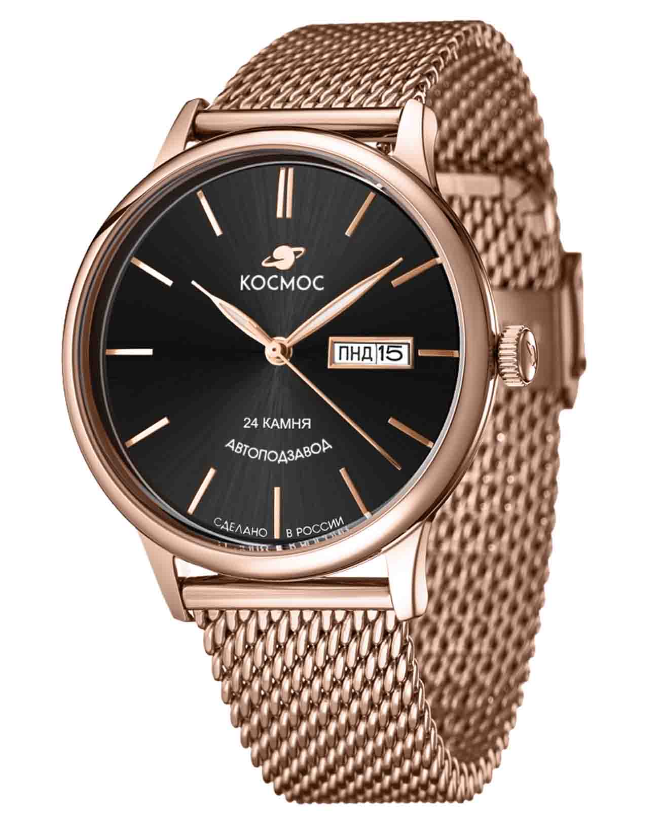 Российские мужские механические часы Космос K 043.40.31 из коллекции Юпитер оснащены механизмом TMI с автоподзаводом на 24 рубинах. Полированный корпус из нержавеющей стали 316L с PVD-покрытиемPVDУльтратонкое покрытие наносится в технике вакуумного напыления, сочетает в себе нитрид титана особой прочности со слоем золота или оксида хрома. Несёт в себе декоративную или защитную функцию. розового золота диаметром 41 мм и толщиной 14 мм защищен минеральным стекломМинеральное стеклоМинеральное стекло представляет собой искусственно выращенный минерал кварца. Такое стекло отличается особой устойчивостью к повреждениям и царапинам. Уступает по некоторым качествам сапфировому стеклу., выпуклым с обеих сторон, что придает ему сходство с силуэтом летающей тарелки. Черный циферблат с градиентной шлифовкой в стиле солнечных лучей украшен изготовленными вручную индексами, крепящимися на двух штифтах. Часовая, минутная стрелки и круг по краю циферблата имеют люминесцентное покрытиеЛюминесцентное покрытиеПозволяет считывать показания времени в темноте. Производители наносят на стрелки, часовые индексы, безель или поверхность циферблата светонакопительный состав, дающий холодное свечение., которое светится в темноте, создавая эффект ореола вокруг Земли. Модель дополнена функциями отображения даты и дня недели. Прозрачная задняя крышка позволяет наблюдать за работой механизма. Часы имеют водонепроницаемость 50 метров, позволит защитить корпус от случайных брызг или капель дождя. Модель комплектуется стальным браслетом миланского плетения на раскладном замкеРаскладной замокДанный вариант застежки используется только на часах с металлическим браслетом. Отличительная особенность такого крепления в том, что длина браслета становится универсальной и вы можете самостоятельно отрегулировать нужный вам размер – застежка просто двигается по браслету часов. с дополнительной защитой от случайного падения. Заводная головка, застежка и браслет украшены фирменным логотипом. Эти часы уникальны, сочетая в себе современные технологии и футуристический дизайн, вдохновленный эпохой покорения космоса. Они станут идеальным выбором для ценителей высокого качества и глубокого смысла в каждой детали.