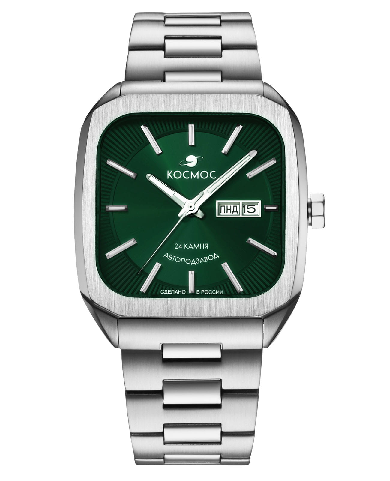 Мужские наручные часы Космос Марсоход K 213.10.37 — часть уникальной лимитированной серии, название которой вдохновлено легендарными аппаратами, способными передвигаться по поверхности Марса. Модель ассоциируется с брутальностью, мастерством и технической сложностью, отражая дух советского инженерного наследия и современные достижения часового искусства. Корпус в форме квадрата с закруглёнными углами выполнен из нержавеющей стали и дополнен сочетанием зеркальной полировки и сатинированной отделки. Заводная головка имеет форму гайки, что добавляет модели индустриальный шарм и подчёркивает её техническую направленность. Задняя крышка — прозрачная и закреплена на четырёх винтах, обеспечивая не только повышенную водонепроницаемость , но и возможность наблюдать за работой механизма TMI. На роторе гравировка с надписью «Сделано в России» и изображением космонавта, что делает модель особенной и символичной. Циферблат зелёного цвета выполнен в двухуровневой структуре. Центральный уровень содержит три стрелки, часовая и минутная из которых имеют люминесцентное покрытиеЛюминесцентное покрытиеПозволяет считывать показания времени в темноте. Производители наносят на стрелки, часовые индексы, безель или поверхность циферблата светонакопительный состав, дающий холодное свечение. для отличной читаемости в темноте. Второй уровень декорирован текстурой, напоминающей солнечные лучи. Сдвоенное окошко даты и дня недели выделено стальной рамкой, а индикация представлена сразу на двух языках — русском и английском. Защиту циферблата обеспечивает сапфировое стеклоСапфировое стеклоПрочный и надёжный материал из кристалла сапфира синтетического происхождения, характеризующийся особой твёрдостью и устойчивостью к царапинам и повреждениям. с антибликовым покрытиемАнтибликовое покрытиеСлой оксида металла в 0,13-0,3 микрон, благодаря которому стекло часов не бликует и не отражает свет. Антибликовое покрытие уменьшает отражение света в 10 раз, обеспечивая отличную читаемость показателей циферблата., гарантирующее чёткость восприятия при любом освещении. Браслет изготовлен из литых звеньев нержавеющей стали и оснащён застёжкой с фирменным логотипом. Ширина браслета составляет 26 мм, что обеспечивает плотное и комфортное прилегание на запястье. Цвет корпуса и браслета — белый металл, гармонично сочетающийся с зелёным циферблатом. Модель имеет размеры 49x42 мм, толщина корпуса — 12,5 мм, что делает часы сбалансированными и удобными в повседневной носке. Часы совместимы с международным стандартом водонепроницаемости , что позволяет использовать их при плавании и других водных активностях. Эти часы станут универсальным аксессуаром для тех, кто ценит сочетание истории, технологичности и стиля — идеальный выбор для уверенных в себе мужчин, следящих за своим имиджем и предпочитающих выделяться.
