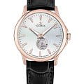 Мужские наручные часы Космос Телескоп K 304.41.33 —  это уникальная лимитированная серия под названием Телескоп, посвящена аппарату приоткрывающего взгляду бескрайние дали космического пространства. Апертура открытого баланса модели по форме напоминает круглую линзу телескопа. Сквозь это окошко, расположенное на черном циферблате, также можно увидеть много интересного: ту самую систему «баланс-спираль» автоматического механизма, которая отвечает за точность хода. Корпус часов выполнен из нержавеющей стали с PVDPVDУльтратонкое покрытие наносится в технике вакуумного напыления, сочетает в себе нитрид титана особой прочности со слоем золота или оксида хрома. Несёт в себе декоративную или защитную функцию. покрытием, классической круглой формы и достаточно тонкий для механических моделей. Это стало возможным благодаря использованию механизма Miyota, калибр 9029, с высотой всего 3.9 мм. Циферблат декорирован вертикальной текстурой в ретро-стиле, по которой движутся крупные часовая и минутная стрелки, имеющие люминесцентное покрытиеЛюминесцентное покрытиеПозволяет считывать показания времени в темноте. Производители наносят на стрелки, часовые индексы, безель или поверхность циферблата светонакопительный состав, дающий холодное свечение., позволяющее определять время даже в темноте. Циферблат защищен прочным сапфировым стеклом с антибликовым покрытиемСапфировое стеклоПрочный и надёжный материал из кристалла сапфира синтетического происхождения, характеризующийся особой твёрдостью и устойчивостью к царапинам и повреждениям., обеспечивающим отличную читаемость показаний в любых условиях. Прозрачная задняя крышка, закрепленная на четырех винтах, демонстрирует механизм и содержит выгравированный индивидуальный номер экземпляра  хх/50, отражающий лимитированный тираж всего в 50 штук. Ремешок часов сделан из натуральной кожи черного цвета и оснащен удобной застёжкой «бабочка» с кнопкамиЗастёжка "бабочка"Такой вид застёжки дополняется предохранителями, помогающими избежать случайного раскрытия браслета. Обладают изящным исполнением. , которая сводит к минимуму вероятность потери. Модель Телескоп сочетает классический дизайн и универсальность, прекрасно подходя как к деловому костюму, так и к более повседневным образам.