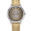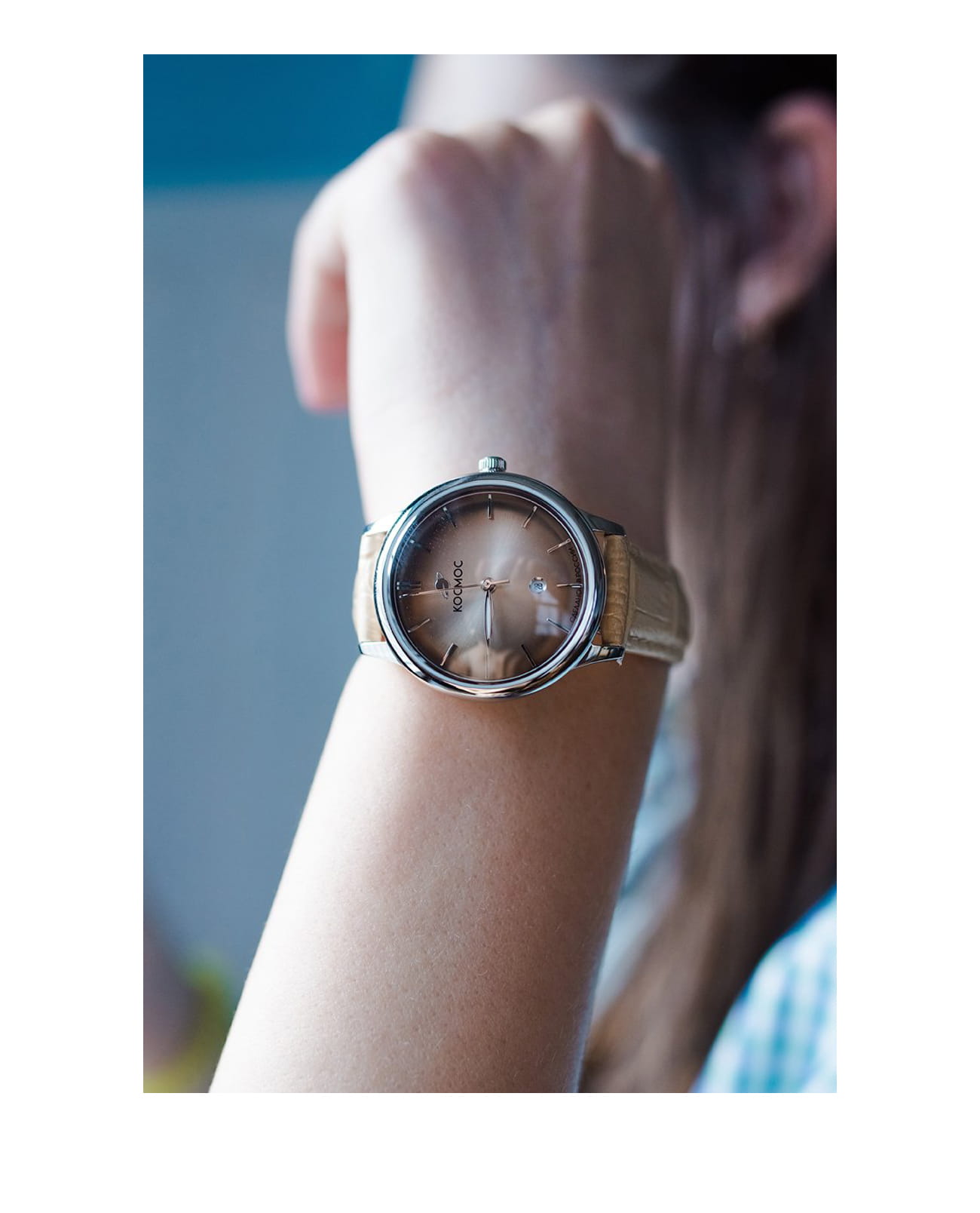 Женские наручные часы Космос Созвездие K 601.12.32 — это сочетание традиций часового искусства 60-70-х годов и футуристического дизайна, вдохновленного космическими исследованиями. Они не только служат напоминанием о прошлом, но и побуждают задуматься о будущем, позволяя наслаждаться качеством и смыслом, вложенными в каждую деталь. Полированный корпус часов выполнен в виде силуэта летающей тарелки благодаря выпуклым формам стекла и нижней части корпуса. Стальные ушки, которые напоминают опоры летающей тарелки, завершает общий образ. На задней крышке часов выгравирован фантазийный сюжет – космическая станция будущего. Название коллекции Созвездие – идеально отражает разнообразие моделей с яркими, но тщательно подобранными цветами. Бежевый циферблат выполнен в ретро стиле, с выгнутыми краями, что требует применения сложной производственной технологии. Такой дизайн был характерен для часов прошлых лет. Кончик секундной стрелки также изогнут, следуя форме циферблата. Выпуклый градиентный циферблат украшен шлифовкой в стиле солнечных лучей и ручными индексами, которые фиксируются на двух штифтах. Окошко даты обрамлено стальной рамкой, что добавляет часам утонченности и элегантности. Часовая и минутная стрелки, а также круг по краю циферблата, напоминающий ореол Земли, с люминесцентным покрытиемЛюминесцентное покрытиеПозволяет считывать показания времени в темноте. Производители наносят на стрелки, часовые индексы, безель или поверхность циферблата светонакопительный состав, дающий холодное свечение., которое светится в темноте, создавая завораживающий эффект. Форма минерального стеклаМинеральное стеклоМинеральное стекло представляет собой искусственно выращенный минерал кварца. Такое стекло отличается особой устойчивостью к повреждениям и царапинам. Уступает по некоторым качествам сапфировому стеклу. тщательно продумана: оно выгнуто как снаружи, так и изнутри. Такая конструкция исключает искажения изображения на циферблате, в отличие от обычного стекла. Ремешок модели сделан из натуральной кожи бежевого цвета. Заводная головка, застежка и ремешок украшены фирменным логотипом.