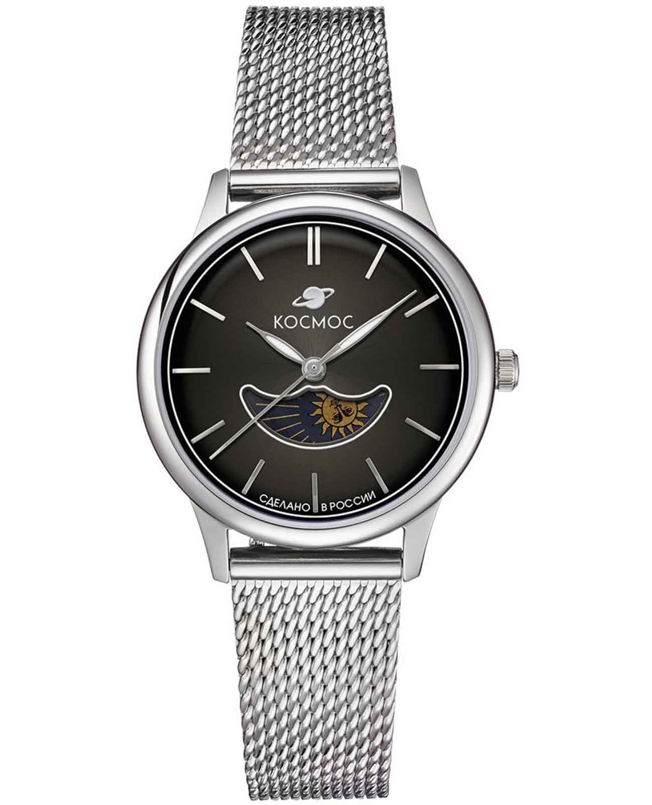 Женские наручные часы Космос Солнце и Луна K 617.10.31 — это сочетание традиций часового искусства 60-70-х годов и футуристического дизайна, вдохновленного космическими исследованиями. Они не только служат напоминанием о прошлом, но и побуждают задуматься о будущем, позволяя наслаждаться качеством и смыслом, вложенными в каждую деталь. Полированный корпус часов выполнен в виде силуэта летающей тарелки благодаря выпуклым формам стекла и нижней части корпуса. Стальные ушки, которые напоминают опоры летающей тарелки, завершает общий образ. На задней крышке часов выгравирован фантазийный сюжет – космическая станция будущего. Элегантные женские часы из серии Солнце и Луна выделяются функцией день/ночь. Циферблат выполнен в ретро-стиле с выгнутыми краями, что требует применения сложных технологий в производстве. Циферблаты такой формы были характерны для часов прошлых эпох. Кончик секундной стрелки изогнут в соответствии с формой циферблата. На градиентном выпуклом циферблате выполнена шлифовка в стиле солнечных лучей, а также размещены индексы, изготовленные вручную и закрепленные на двух штифтах. Часовая и минутная стрелки, а также круг по краю циферблата, напоминающий ореол Земли, с люминесцентным покрытиемЛюминесцентное покрытиеПозволяет считывать показания времени в темноте. Производители наносят на стрелки, часовые индексы, безель или поверхность циферблата светонакопительный состав, дающий холодное свечение., которое светится в темноте, создавая завораживающий эффект. Форма минерального стеклаМинеральное стеклоМинеральное стекло представляет собой искусственно выращенный минерал кварца. Такое стекло отличается особой устойчивостью к повреждениям и царапинам. Уступает по некоторым качествам сапфировому стеклу. тщательно продумана: оно выгнуто как снаружи, так и изнутри. Такое решение позволяет избежать искажения изображения на циферблате, в отличие от стекла с прямой внутренней частью, которое создает эффект линзы. Модель оснащена гибким и прочным браслетом миланского плетения. Заводная головка, застежка и ремешок украшены фирменным логотипом.