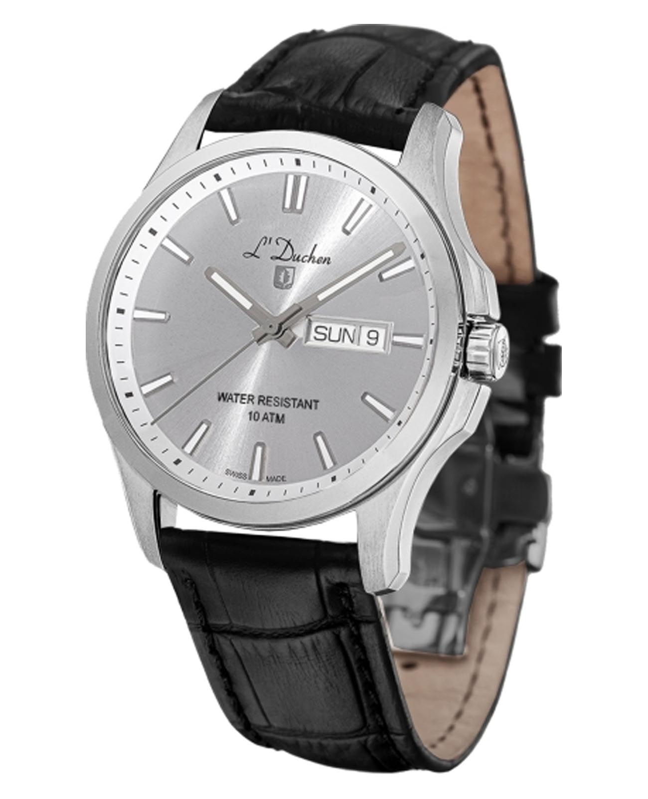 Мужские швейцарские часы L'Duchen Dynamique D 261.11.33, кварцевый механизм с высокой точностью. Сапфировое стеклоСапфировое стеклоПрочный и надёжный материал из кристалла сапфира синтетического происхождения, характеризующийся особой твёрдостью и устойчивостью к царапинам и повреждениям. устойчивое к появлению царапин, обладающее высокой прозрачностью. Корпус часов выполнен из нержавеющей стали. Стрелки с люминесцентным покрытиемЛюминесцентное покрытиеПозволяет считывать показания времени в темноте. Производители наносят на стрелки, часовые индексы, безель или поверхность циферблата светонакопительный состав, дающий холодное свечение.. Класс водозащиты: 100 метров, позволит плавать, нырять и заниматься другими водными видами спорта. Кожаный ремешок на застёжке «бабочка» с кнопкамиЗастёжка "бабочка"Такой вид застёжки дополняется предохранителями, помогающими избежать случайного раскрытия браслета. Обладают изящным исполнением. .