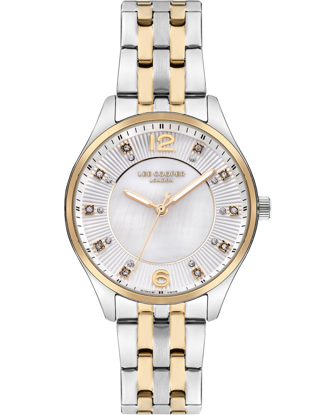 Женские часы Lee Cooper LC07832.220 выполнены в классическом стиле и сочетают строгий дизайн с надёжным механизмом. Модель оснащена кварцевым механизмом, обеспечивающим точность хода и минимальное обслуживание. Корпус круглой формы имеет размер 34 мм, изготовлен из суперметалла с изысканным неподвижным безелемБезельВнешний ободок, закрепляющий стекло. В спортивных часах так называется поворотное кольцо с делениями на циферблате, выполняет роль таймера – замеряет отрезки времени на шкале. Неподвижный безель – элемент декора. Однонаправленно вращающийся безель на дайверских часах позволяет фиксировать моменты погружения и выныривания на поверхность. с IP-покрытиемIP-покрытиеМетод ионного напыления. Демонстрирует повышенную устойчивость к истиранию, окислению и химическим веществам. Под воздействием высокого давления и температуры около 1500°C молекулы металла надёжно соединяются с частицами корпуса часов., гарантирует комфорт при ношении. Циферблат дополнен изящными вставками из циркона для чёткого отсчёта времени. Защиту циферблата обеспечивает минеральное стеклоМинеральное стеклоМинеральное стекло представляет собой искусственно выращенный минерал кварца. Такое стекло отличается особой устойчивостью к повреждениям и царапинам. Уступает по некоторым качествам сапфировому стеклу., устойчивое к мелким механическим повреждениям. Стрелки с люминесцентным покрытиемЛюминесцентное покрытиеПозволяет считывать показания времени в темноте. Производители наносят на стрелки, часовые индексы, безель или поверхность циферблата светонакопительный состав, дающий холодное свечение.. Стальной браслет с частичным IP-покрытиемIP-покрытиеМетод ионного напыления. Демонстрирует повышенную устойчивость к истиранию, окислению и химическим веществам. Под воздействием высокого давления и температуры около 1500°C молекулы металла надёжно соединяются с частицами корпуса часов. на раскладной застёжкеРаскладная застёжкаТакой тип застёжки используется только на браслетах из металла. Она никогда не раскрывается полностью, происходит разделение на 2 и более частей. Раскладывающая застёжка снизит вероятность потери часов к минимуму. гарантирует удобную посадку и надёжную фиксацию на запястье. Водозащита 30WR позволяет использовать часы в повседневных условиях без риска повреждения от случайных брызг воды. Это сочетание классического дизайна, прочности материалов и качества исполнения для уверенных в себе женщин.