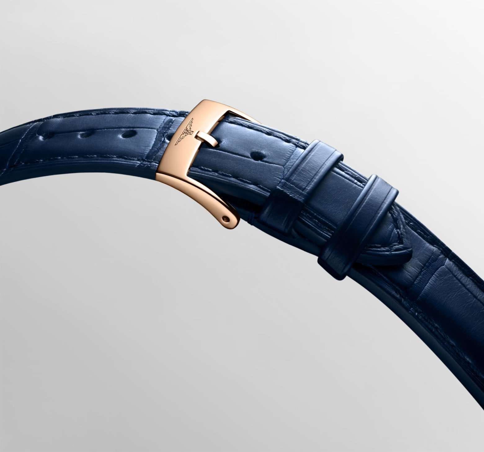 Ремешок выполнен из кожи аллигатора и дополнен застёжкой, изготовленной из розового золота, соответствующего корпусу. Водозащита до 3 ATM делает модель подходящей для повседневной носки при аккуратном использовании.