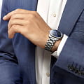 Часы Longines Master Collection Annual Calendar (артикул L29204926) сочетают в себе элегантность и функциональность, отражая богатое часовое наследие Longines. Корпус диаметром 42 мм выполнен из нержавеющей стали с водозащитой до 3 бар (30 метров). Синий циферблат с солнечным узором оснащён накладными индексами, серебристыми полированными стрелками и указателем месяца и даты в положении «3 часа». Циферблат защищён сапфировым стекломСапфировое стеклоПрочный и надёжный материал из кристалла сапфира синтетического происхождения, характеризующийся особой твёрдостью и устойчивостью к царапинам и повреждениям. с антибликовым покрытием.