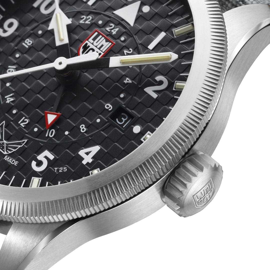 Эти часы Luminox x VOLITION AMERICA Flight Force Pilot Watch XA.9522.VOL это новейшая модель, вдохновленная шлемами, которые носят военнослужащие ВВС США. Они оснащены 42-миллиметровым черным циферблатом, защищенным сапфировым стекломСапфировое стеклоПрочный и надёжный материал из кристалла сапфира синтетического происхождения, характеризующийся особой твёрдостью и устойчивостью к царапинам и повреждениям. с антибликовым покрытиемАнтибликовое покрытиеСлой оксида металла в 0,13-0,3 микрон, благодаря которому стекло часов не бликует и не отражает свет. Антибликовое покрытие уменьшает отражение света в 10 раз, обеспечивая отличную читаемость показателей циферблата., и стильным серым тканевым ремешком с фирменной классической застежкой застежкой Luminox. Часы обладают функцией GMTGMTОтображение времени второго часового пояса.Такая функция особенно актуальна для путешественников и бизнесменов,которые общаются с людьми из разных стран,теперь вы всегда будете знать,какой час у вашего партнёра или близкого человека., что позволяет отслеживать время в двух часовых поясах одновременно, делая их идеальными спутниками для путешественников по всему миру. Дизайн с характерным треугольником и двумя точками под отметкой 12 часов, что обеспечивает быструю ориентацию и легкость считывания времени. Механизм на базе швейцарского кварца RONDA 515.24H обеспечивает работу часов до 50 месяцев без замены батареи, а постоянное свечение циферблата сохраняется до 25 лет благодаря LLTLLTLLT — это автономный механизм подсветки, основанный на использовании микроскопических газонаполненных элементов. Специальные герметичные капсулы из боросиликатного стекла, интегрированные в циферблат, генерируют свечение без необходимости подключения к внешним источникам энергии. Для их работы не требуется ни дополнительный свет, ни механическое воздействие (например, нажатие кнопки). Свечение возникает благодаря химическому процессу: реакция между тритием, заключенным в капсулах, и люминофорным покрытием создает стабильное автономное освещение. Технология обеспечивает энергетическую независимость и долговечность подсветки.-подсветке. Корпус выполнен из нержавеющей стали 316L и выдерживает погружение на глубину до 100 метров. Завинчивающаяся заводная головка и прозрачная задняя крышка из нержавеющей стали добавляют прочности и эстетической привлекательности.