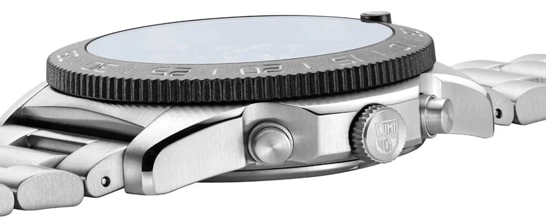 Швейцарские наручные часы Luminox Pacific Diver Chronograph XS.3141.M – это идеальный симбиоз стиля и высокой функциональности. Оснащенные высокоточным кварцевым механизмом, они гарантируют безупречное времяизмерение и надежность в любом случае. Часы-хронографХронографФункция позволяет измерять отрезки времени с особой точностью: часы, минуты, секунды. Верным признаком хронографа является наличие на циферблате 3 дополнительных окошек-счётчиков. обладают функцией секундомераСекундомерСекундоме́р — прибор, способный измерять интервалы времени с точностью до долей секунды., что делает их практичными в использовании. Циферблат этих часов защищен сапфировым стекломСапфировое стеклоПрочный и надёжный материал из кристалла сапфира синтетического происхождения, характеризующийся особой твёрдостью и устойчивостью к царапинам и повреждениям. с антибликовым покрытиемАнтибликовое покрытиеСлой оксида металла в 0,13-0,3 микрон, благодаря которому стекло часов не бликует и не отражает свет. Антибликовое покрытие уменьшает отражение света в 10 раз, обеспечивая отличную читаемость показателей циферблата., которое славится своей прочностью и устойчивостью к царапинам, обеспечивая кристально чистый обзор. Корпус часов выполнен из качественной стали, что свидетельствует о долговечности и прочности изделия. Стрелки с LLTLLTLLT — это автономный механизм подсветки, основанный на использовании микроскопических газонаполненных элементов. Специальные герметичные капсулы из боросиликатного стекла, интегрированные в циферблат, генерируют свечение без необходимости подключения к внешним источникам энергии. Для их работы не требуется ни дополнительный свет, ни механическое воздействие (например, нажатие кнопки). Свечение возникает благодаря химическому процессу: реакция между тритием, заключенным в капсулах, и люминофорным покрытием создает стабильное автономное освещение. Технология обеспечивает энергетическую независимость и долговечность подсветки.-подсветкой, обеспечивают отличную видимость даже в условиях недостаточной освещенности, что делает их удобными для использования в любых условиях. Дополнительно часы располагают окошком даты в положении 4 часа, позволяющим быстро и удобно отслеживать текущую дату. Их внушительный класс водозащиты в 200 метров делает их идеальными для любителей водных видов спорта, таких как плавание и ныряние, не беспокоясь о повреждении механизма. Стальной ремешок, надёжно фиксирующий часы на запястье с помощью раскладной застёжкиРаскладная застёжкаТакой тип застёжки используется только на браслетах из металла. Она никогда не раскрывается полностью, происходит разделение на 2 и более частей. Раскладывающая застёжка снизит вероятность потери часов к минимуму., обеспечивает комфортное ношение в течение всего дня. Стильный вращающийся безельБезельВнешний ободок, закрепляющий стекло. В спортивных часах так называется поворотное кольцо с делениями на циферблате, выполняет роль таймера – замеряет отрезки времени на шкале. Неподвижный безель – элемент декора. Однонаправленно вращающийся безель на дайверских часах позволяет фиксировать моменты погружения и выныривания на поверхность., изготовленный из карбонаКарбонОт «carbon», «carbone» - углерод, углепластик - полимерный композиционный материал из переплетён