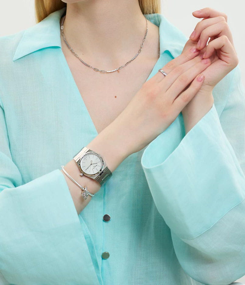 Женские кварцевые часы Mathey-Tissot Zoltan D117AS — это стильное сочетание элегантности и современного дизайна. Изящный корпус выполнен из нержавеющей стали, диаметром 34 мм, что придаст образу женственности и романтизма. Изысканный циферблат с метками в виде штрихов придает модели особый блеск. Циферблат защищен сапфировым стекломСапфировое стеклоПрочный и надёжный материал из кристалла сапфира синтетического происхождения, характеризующийся особой твёрдостью и устойчивостью к царапинам и повреждениям., обеспечивающий устойчивость к царапинам. Стрелки и метки с люминесцентным покрытиемЛюминесцентное покрытиеПозволяет считывать показания времени в темноте. Производители наносят на стрелки, часовые индексы, безель или поверхность циферблата светонакопительный состав, дающий холодное свечение.. Окошко даты находится в положении 3 часа. Часы оснащены надежным кварцевым механизмом. Стальной браслет на застёжке-бабочке с кнопкамиЗастёжка "бабочка"Такой вид застёжки дополняется предохранителями, помогающими избежать случайного раскрытия браслета. Обладают изящным исполнением. , гарантирует комфортное и безопасное ношение. Класс водозащиты: 50 метров позволит защитить корпус от случайных брызг или капель дождя. Mathey-Tissot  — отличный выбор для тех, кто ценит утонченность и качество.