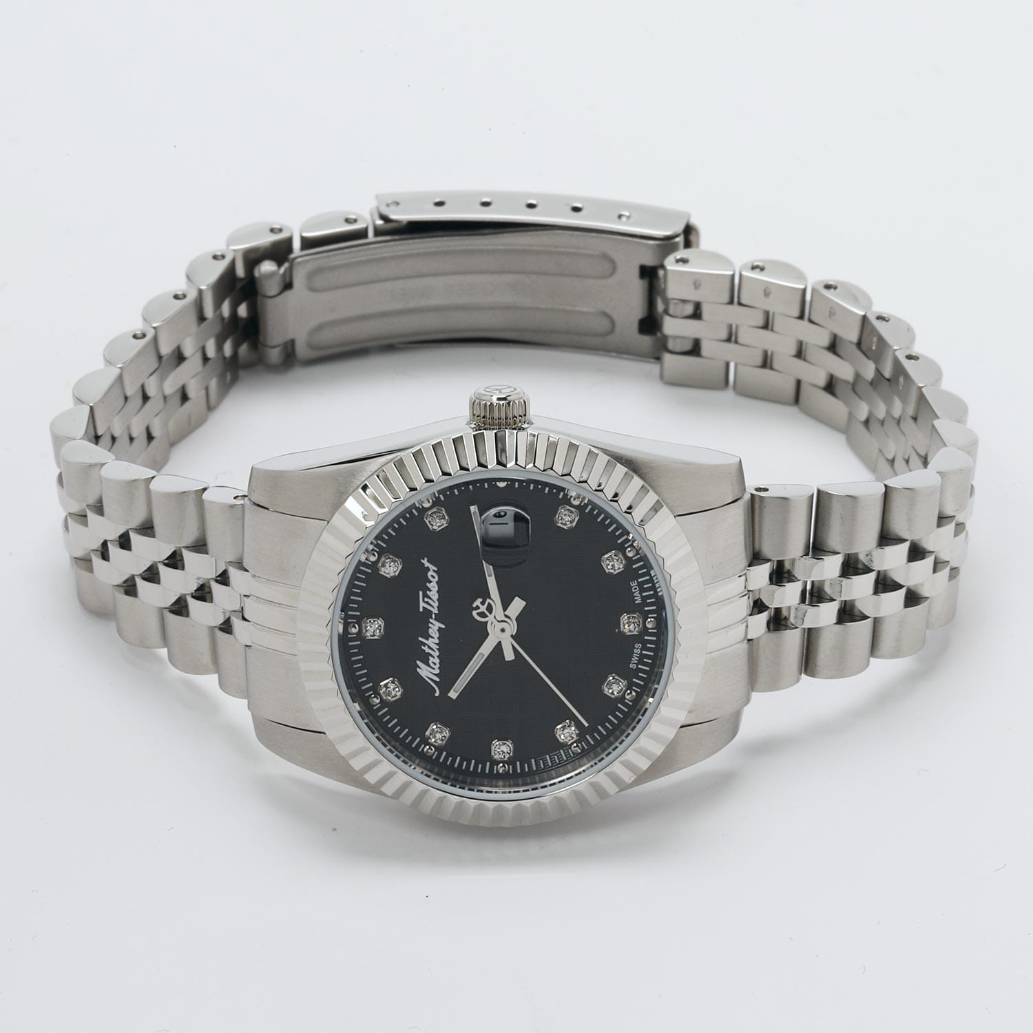 Женские кварцевые часы Mathey-Tissot Rolly D810AN — это стильное сочетание элегантности и современного дизайна. Изящный корпус выполнен из нержавеющей стали, диаметром 30 мм, что придаст образу женственности и романтизма. Изысканный циферблат с метками в виде точек придает модели особый блеск. Циферблат защищен минеральным стекломМинеральное стеклоМинеральное стекло представляет собой искусственно выращенный минерал кварца. Такое стекло отличается особой устойчивостью к повреждениям и царапинам. Уступает по некоторым качествам сапфировому стеклу., обеспечивающий устойчивость к царапинам. Стрелки с люминесцентным покрытиемЛюминесцентное покрытиеПозволяет считывать показания времени в темноте. Производители наносят на стрелки, часовые индексы, безель или поверхность циферблата светонакопительный состав, дающий холодное свечение.. Рифленый безельБезельВнешний ободок, закрепляющий стекло. В спортивных часах так называется поворотное кольцо с делениями на циферблате, выполняет роль таймера – замеряет отрезки времени на шкале. Неподвижный безель – элемент декора. Однонаправленно вращающийся безель на дайверских часах позволяет фиксировать моменты погружения и выныривания на поверхность. серебристого цвета. Циферблат украшен кристаллами. Окошко даты находится в положении 3 часа. Часы оснащены надежным кварцевым механизмом. Стальной браслет на раскладной застёжкеРаскладная застёжкаТакой тип застёжки используется только на браслетах из металла. Она никогда не раскрывается полностью, происходит разделение на 2 и более частей. Раскладывающая застёжка снизит вероятность потери часов к минимуму., гарантирует комфортное и безопасное ношение. Класс водозащиты: 50 метров позволит защитить корпус от случайных брызг или капель дождя. Mathey-Tissot — отличный выбор для тех, кто ценит утонченность и качество.