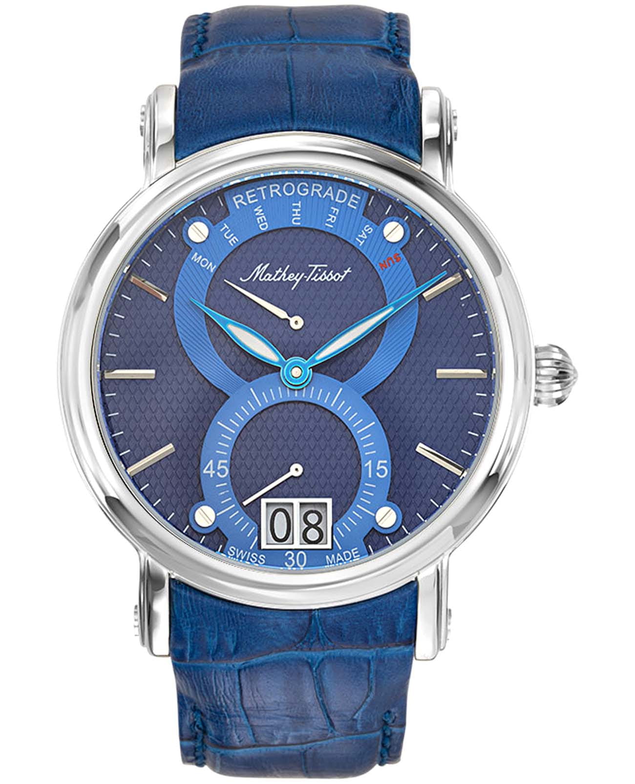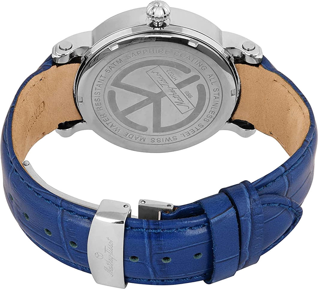 Mathey-Tissot Retrograde H7022ABU — практичные часы с ярким дизайном и ретроградным указателем дня недели станут отличным вариантом на каждый день. Изящный корпус выполнен из нержавеющей стали, диаметром 43 мм, что придаст образу элегантности и надежности. Изысканный циферблат с метками в виде штрихов придает модели особый блеск. Циферблат защищен минеральным стекломМинеральное стеклоМинеральное стекло представляет собой искусственно выращенный минерал кварца. Такое стекло отличается особой устойчивостью к повреждениям и царапинам. Уступает по некоторым качествам сапфировому стеклу., обеспечивает устойчивость к царапинам. Стрелки с люминесцентным покрытиемЛюминесцентное покрытиеПозволяет считывать показания времени в темноте. Производители наносят на стрелки, часовые индексы, безель или поверхность циферблата светонакопительный состав, дающий холодное свечение.. Окошко даты находится в положении 6 часов. Часы оснащены надежным кварцевым механизмом. Кожаный ремешок на раскладной застёжкеРаскладная застёжкаТакой тип застёжки используется только на браслетах из металла. Она никогда не раскрывается полностью, происходит разделение на 2 и более частей. Раскладывающая застёжка снизит вероятность потери часов к минимуму. гарантирует комфортное и безопасное ношение. Класс водозащиты: 50 метров позволит защитить корпус от случайных брызг или капель дождя. Mathey-Tissot  — отличный выбор для тех, кто ценит утонченность и качество.