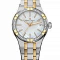 Мужские швейцарские кварцевые часы Maurice Lacroix Aikon Quartz AI1106-PVPD2-170-1. Сапфировое стеклоСапфировое стеклоПрочный и надёжный материал из кристалла сапфира синтетического происхождения, характеризующийся особой твёрдостью и устойчивостью к царапинам и повреждениям. устойчивое к появлению царапин, обладающее высокой прозрачностью. Перламутровый циферблат. Стрелки с люминесцентным покрытиемЛюминесцентное покрытиеПозволяет считывать показания времени в темноте. Производители наносят на стрелки, часовые индексы, безель или поверхность циферблата светонакопительный состав, дающий холодное свечение.. Метки на циферблате и безельБезельВнешний ободок, закрепляющий стекло. В спортивных часах так называется поворотное кольцо с делениями на циферблате, выполняет роль таймера – замеряет отрезки времени на шкале. Неподвижный безель – элемент декора. Однонаправленно вращающийся безель на дайверских часах позволяет фиксировать моменты погружения и выныривания на поверхность. украшены бриллиантами. Класс водозащиты: 100 метров, позволит плавать, нырять и заниматься другими водными видами спорта. Окошко даты находится в положении 3 часов. Корпус и браслет часов изготовлены из стали с частичным PVD-покрытиемPVDУльтратонкое покрытие наносится в технике вакуумного напыления, сочетает в себе нитрид титана особой прочности со слоем золота или оксида хрома. Несёт в себе декоративную или защитную функцию.. Браслет с застёжкой «бабочка» с кнопкамиЗастёжка "бабочка"Такой вид застёжки дополняется предохранителями, помогающими избежать случайного раскрытия браслета. Обладают изящным исполнением. .