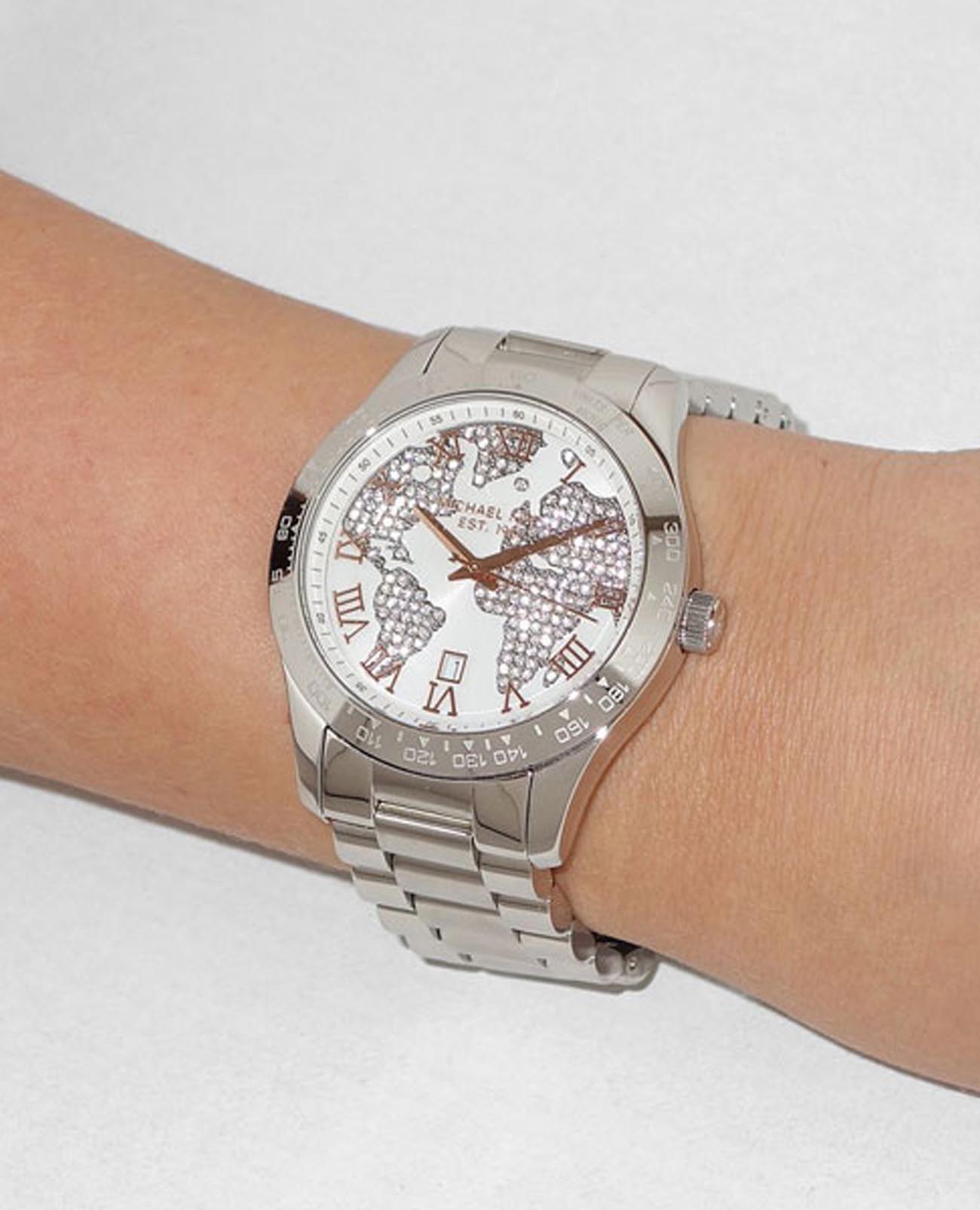 Женские американские часы с минеральным стекломМинеральное стеклоМинеральное стекло представляет собой искусственно выращенный минерал кварца. Такое стекло отличается особой устойчивостью к повреждениям и царапинам. Уступает по некоторым качествам сапфировому стеклу. Michael Kors Bradshaw MK5958, кварцевый механизм с высокой точностью. Корпус часов изготовлен из стали. Серебристый циферблат украшен рисунком в виде карты мира выложенным стразами. Окошко даты находится в положении 6 часов. Класс водозащиты: 100 метров, позволит плавать, нырять и заниматься другими водными видами спорта. Стальной браслет на раскладной застёжкеРаскладная застёжкаТакой тип застёжки используется только на браслетах из металла. Она никогда не раскрывается полностью, происходит разделение на 2 и более частей. Раскладывающая застёжка снизит вероятность потери часов к минимуму..