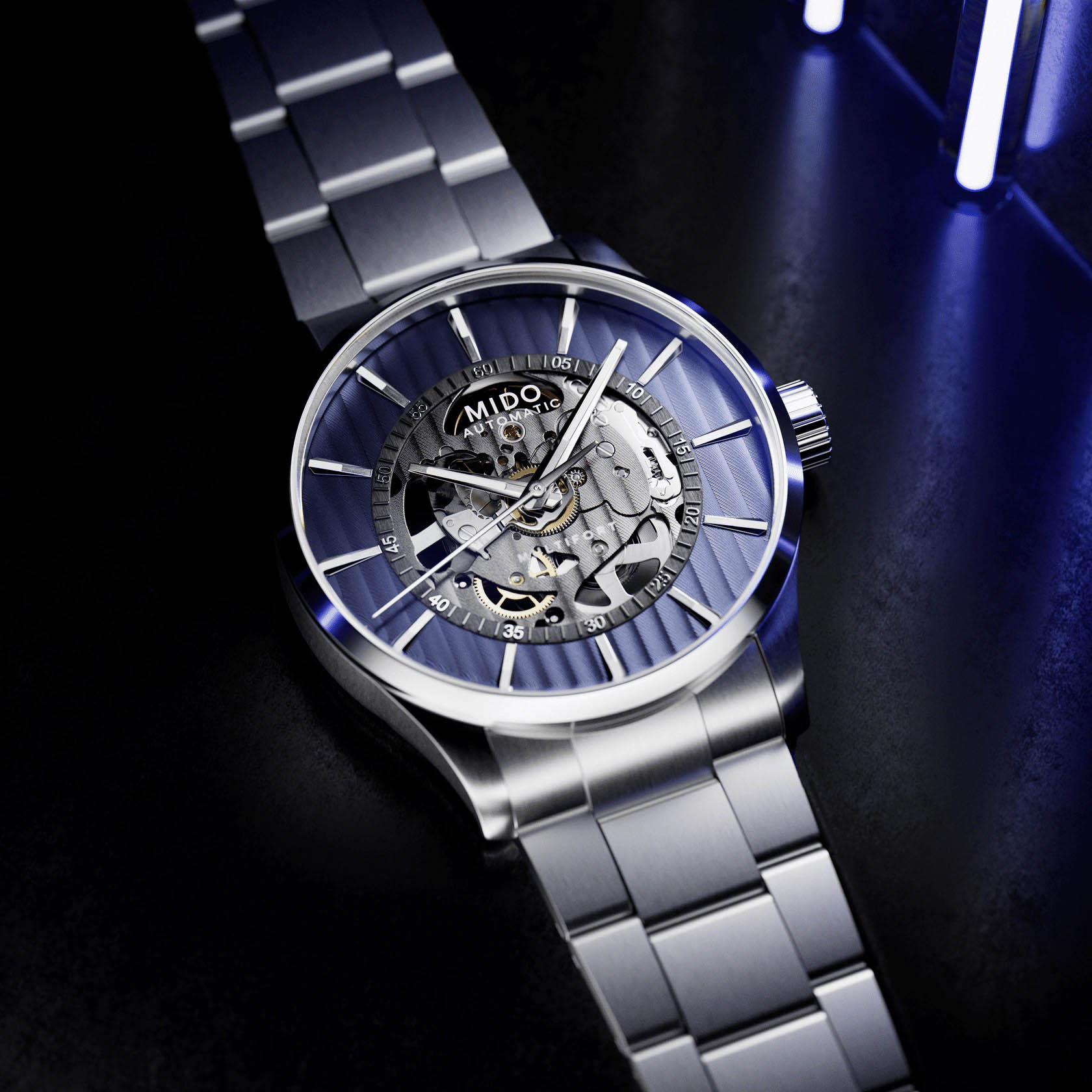 Мужские швейцарские механические часы с хронометром Mido Multifort Skeleton Vertigo M038.436.11.041.00, механический механизм (автоматический калибр) с высокой точностью. Сапфировое стеклоСапфировое стеклоПрочный и надёжный материал из кристалла сапфира синтетического происхождения, характеризующийся особой твёрдостью и устойчивостью к царапинам и повреждениям. устойчивое к появлению царапин, обладающее высокой прозрачностью. Класс водозащиты: 100 метров, позволит плавать, нырять и заниматься другими водными видами спорта. Корпус часов изготовлен из нержавеющей стали.