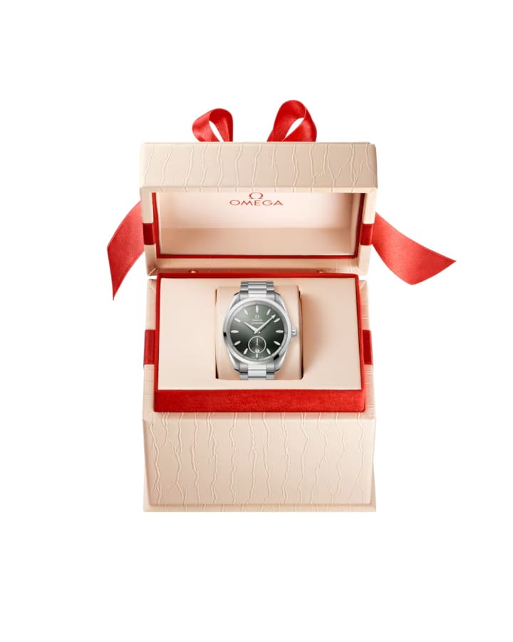 Наручные часы Omega Seamaster Aqua Terra выполнены в корпусе из нержавеющей стали диаметром 38 мм , толщиной 12,7 мм , ширина между ушками — 19 мм , общий вес составляет около 124 грамма. Циферблат тёмно-зелёного цвета имеет окошко даты в положении 6 часов и дополнительный циферблат малой секундной стрелки с кольцом из белого золота 18К. Стрелки с покрытием из родия и индексы в форме корпусов парусных яхт с вставками из перламутра придают модели элегантности. Стрелки и индексы оснащены белым люминесцентным покрытиемЛюминесцентное покрытиеПозволяет считывать показания времени в темноте. Производители наносят на стрелки, часовые индексы, безель или поверхность циферблата светонакопительный состав, дающий холодное свечение., обеспечивающим читаемость в темноте. Стекло — выпуклое сапфировое стекло сапфировое стеклоСапфировое стеклоПрочный и надёжный материал из кристалла сапфира синтетического происхождения, характеризующийся особой твёрдостью и устойчивостью к царапинам и повреждениям. с двусторонним антибликовым покрытием антибликовое покрытиеАнтибликовое покрытиеСлой оксида металла в 0,13-0,3 микрон, благодаря которому стекло часов не бликует и не отражает свет. Антибликовое покрытие уменьшает отражение света в 10 раз, обеспечивая отличную читаемость показателей циферблата., задняя крышка прозрачная, украшена волнообразной гравировкой. Механизм — механический с автоподзаводом , калибр OMEGA Master Chronometer 8802 , сертифицированный METAS. Обладает запасом хода до 55 часов , антимагнитными свойствами и точностью от 0 до +5 секунд в сутки благодаря коаксиальному спуску и балансу из кремния. Функции: центральные часовая и минутная стрелки, малый циферблат секунд, индикация даты. Водозащита — 15 АТМ (150 метров) , что позволяет использовать часы в воде, включая плавание и дайвинг. Часы оснащены металлическим браслетом с полированной и матовой отделкой звеньев, застёжка — раскладная, с функцией быстрого регулирования. Это технологичная модель для делового и активного образа жизни, сочетающая морское наследие, швейцарское качество и современные стандарты исполнения.