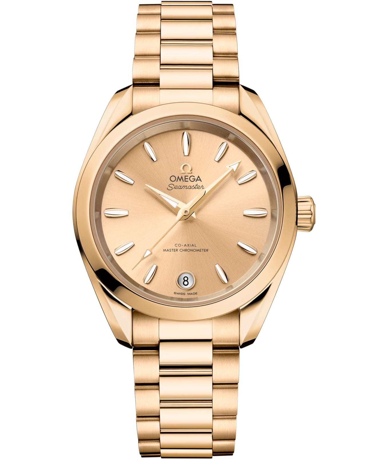 Часы Omega Seamaster Aqua Terra выполнены в симметричном корпусе из 18K Moonshine™ золота с завинчивающейся задней крышкой, украшенной волновым узором. Циферблат жёлтого цвета выполнен методом солнечной шлифовки и дополнен окошком даты на 6 часах, оформленным в том же сплаве. Стрелки и метки выполнены из 18K Moonshine™ золота и оснащены люминесцентным покрытиемЛюминесцентное покрытиеПозволяет считывать показания времени в темноте. Производители наносят на стрелки, часовые индексы, безель или поверхность циферблата светонакопительный состав, дающий холодное свечение. Super-LumiNova для лучшей читаемости в темноте. Индексы в форме корпусов парусников подчёркивают морское наследие коллекции. Калибр Omega 8801 сертифицирован как Master Chronometer — гарантия высочайшей точности и устойчивости к магнитным полям. Запас хода составляет 55 часов. Защиту циферблата обеспечивает сапфировое стеклоСапфировое стеклоПрочный и надёжный материал из кристалла сапфира синтетического происхождения, характеризующийся особой твёрдостью и устойчивостью к царапинам и повреждениям. с антибликовым покрытиемАнтибликовое покрытиеСлой оксида металла в 0,13-0,3 микрон, благодаря которому стекло часов не бликует и не отражает свет. Антибликовое покрытие уменьшает отражение света в 10 раз, обеспечивая отличную читаемость показателей циферблата. с обеих сторон. Водозащита позволяет использовать часы в воде без риска повреждения. Часы установлены на интегрированный браслет с полированными центральными звеньями и матовыми внешними. Это сочетание премиального качества, технологичности и классического дизайна.