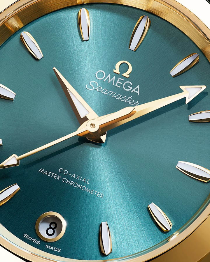 Часы Omega Seamaster Aqua Terra выполнены в симметричном корпусе из полированного 18K Moonshine™ золота с завинчивающейся задней крышкой, украшенной волновым узором. Модель дополнена конической заводной головкой и окошком даты на 6 часах, оформленным кольцом из 18K Moonshine™ золота. Циферблат лагунного оттенка обработан методом CVD и дополнен серебристыми вставками. Стрелки и метки выполнены из 18K Moonshine™ золота и оснащены люминесцентным покрытиемЛюминесцентное покрытиеПозволяет считывать показания времени в темноте. Производители наносят на стрелки, часовые индексы, безель или поверхность циферблата светонакопительный состав, дающий холодное свечение. Super-LumiNova для лучшей читаемости в темноте. Индексы в форме корпусов парусников подчёркивают морское наследие коллекции. Калибр Omega 8801 сертифицирован как Master Chronometer — гарантия высочайшей точности и устойчивости к магнитным полям. Запас хода составляет 55 часов. Защиту циферблата обеспечивает сапфировое стеклоСапфировое стеклоПрочный и надёжный материал из кристалла сапфира синтетического происхождения, характеризующийся особой твёрдостью и устойчивостью к царапинам и повреждениям. с антибликовым покрытиемАнтибликовое покрытиеСлой оксида металла в 0,13-0,3 микрон, благодаря которому стекло часов не бликует и не отражает свет. Антибликовое покрытие уменьшает отражение света в 10 раз, обеспечивая отличную читаемость показателей циферблата. с обеих сторон. Водозащита позволяет использовать часы в воде без риска повреждения. Часы установлены на кожаный ремешок изумрудного цвета. Вес модели — около 86 грамм. Это сочетание премиального качества, технологичности и классического дизайна.