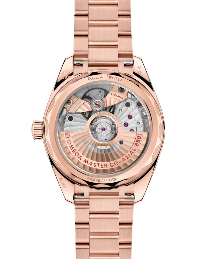 Часы Omega Seamaster Aqua Terra выполнены в симметричном корпусе из 18K Sedna™ золота с завинчивающейся задней крышкой, украшенной волновым узором. Безель инкрустирован бриллиантами, что добавляет модели роскошный акцент. Циферблат лавандового цвета обработан методом CVD и дополнен окошком даты на 6 часах, окаймлённым кольцом из 18K Sedna™ золота. Часовые метки выполнены в виде бриллиантов, а стрелки — из 18K Sedna™ золота с люминесцентным покрытиемЛюминесцентное покрытиеПозволяет считывать показания времени в темноте. Производители наносят на стрелки, часовые индексы, безель или поверхность циферблата светонакопительный состав, дающий холодное свечение. для лучшей читаемости в темноте. Калибр Omega 8801 сертифицирован как Master Chronometer — гарантия высочайшей точности и устойчивости к магнитным полям. Запас хода составляет 55 часов. Защиту циферблата обеспечивает сапфировое стеклоСапфировое стеклоПрочный и надёжный материал из кристалла сапфира синтетического происхождения, характеризующийся особой твёрдостью и устойчивостью к царапинам и повреждениям. с антибликовым покрытиемАнтибликовое покрытиеСлой оксида металла в 0,13-0,3 микрон, благодаря которому стекло часов не бликует и не отражает свет. Антибликовое покрытие уменьшает отражение света в 10 раз, обеспечивая отличную читаемость показателей циферблата. с обеих сторон. Водозащита позволяет использовать часы в воде без риска повреждения. Часы установлены на браслет из 18K Sedna™ золота с раскладной застёжкойРаскладная застёжкаТакой тип застёжки используется только на браслетах из металла. Она никогда не раскрывается полностью, происходит разделение на 2 и более частей. Раскладывающая застёжка снизит вероятность потери часов к минимуму.. Это сочетание премиального качества, технологичности и классического дизайна.
