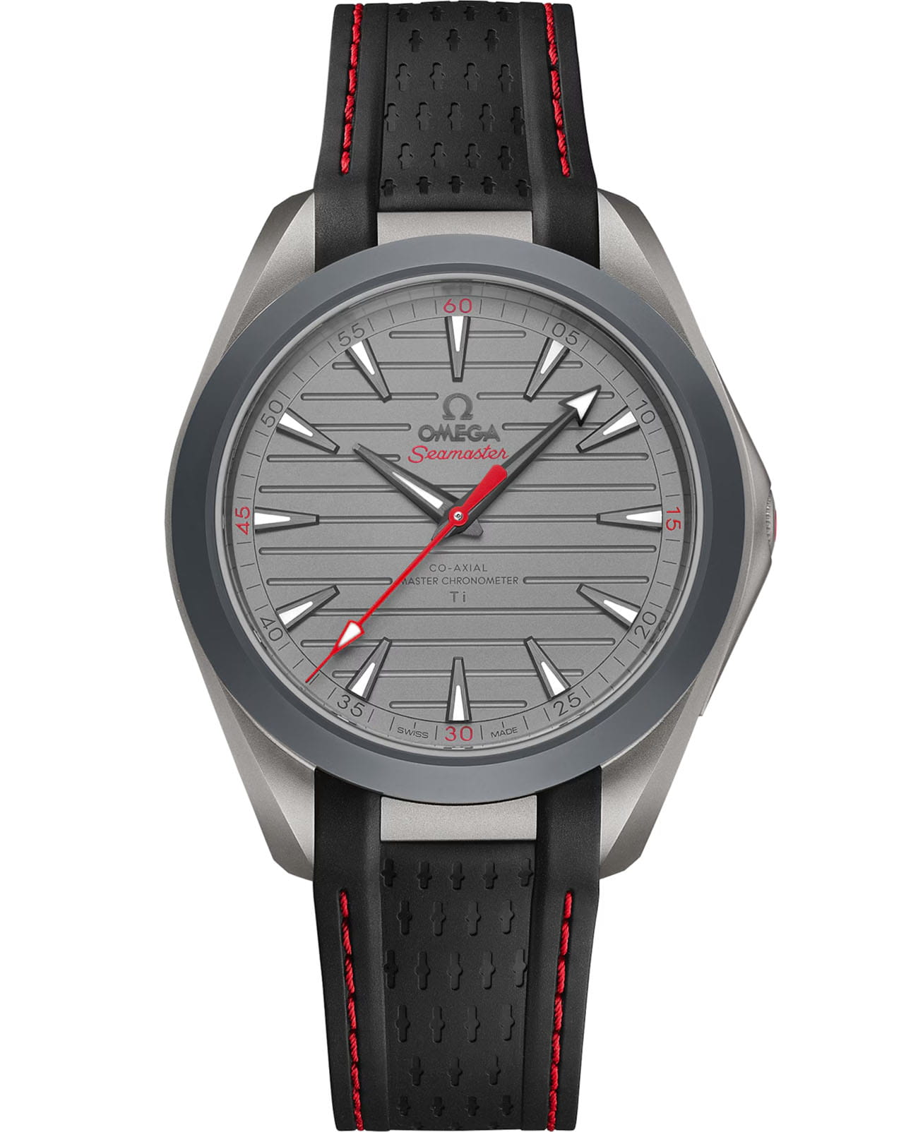 Omega Seamaster Aqua Terra выполнены в корпусе из авиационного титана Gamma Titanium, что делает их исключительно лёгкими. Модель оснащена завинчивающейся задней крышкой с прозрачным окном и винтовой заводной головкой с телескопической конструкцией для защиты от случайного открытия. Циферблат дополнен окошком даты и оформлен горизонтальным рисунком, вдохновлённым текстурой тикового дерева палуб яхт. Секундная стрелка выделена насыщенным красным цветом, а стрелки и метки оснащены люминесцентным покрытиемЛюминесцентное покрытиеПозволяет считывать показания времени в темноте. Производители наносят на стрелки, часовые индексы, безель или поверхность циферблата светонакопительный состав, дающий холодное свечение. Super-LumiNova для лучшей читаемости в темноте. Калибр Omega 8928 Ti — первый в истории Omega, выполненный полностью из титана. Он сертифицирован как Master Chronometer, что гарантирует высочайшую точность и устойчивость к магнитным полям. Запас хода составляет 72 часа. тЗащиту циферблата обеспечивает сапфировое стеклоСапфировое стеклоПрочный и надёжный материал из кристалла сапфира синтетического происхождения, характеризующийся особой твёрдостью и устойчивостью к царапинам и повреждениям. с антибликовым покрытиемАнтибликовое покрытиеСлой оксида металла в 0,13-0,3 микрон, благодаря которому стекло часов не бликует и не отражает свет. Антибликовое покрытие уменьшает отражение света в 10 раз, обеспечивая отличную читаемость показателей циферблата. с обеих сторон. Водозащита позволяет использовать часы в воде без риска повреждения. Часы установлены на черный каучуковый ремешок с контрастной красной строчкой. Это сочетание сверхлёгкого исполнения, прочности и уникального дизайна, созданного для спорта и повседневной носки.